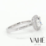 This is our rendition of a classically romantic setting. The brilliance of your centre stone is enhanced by a series of individually handset pavé diamonds. Carefully designed to sit at a perfect height on your finger and flush with your matching wedding ring, our signature finely sculpted wire basket flows seamlessly toward the underside of the halo, drawing in light so your diamond shines bright. Handmade in 9ct or 18ct white gold.
