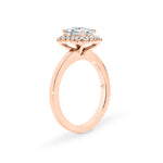 This is our rendition of a classically romantic setting. The brilliance of your centre stone is enhanced by a series of individually handset pavé diamonds. Carefully designed to sit at a perfect height on your finger and flush with your matching wedding ring, our signature finely sculpted wire basket flows seamlessly toward the underside of the halo, drawing in light so your diamond shines bright. Handmade in 9ct or 18ct rose gold.