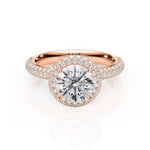 This stunning double halo micropavé diamond engagement ring features a round brilliant diamond central stone surrounded by a double halo of diamonds. Three rows of micropavé diamonds are set on the shoulders capturing and reflecting light from every angle. Handmade in 9ct or 18ct rose gold.