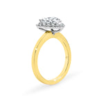 This is our rendition of a classically romantic setting. The brilliance of your centre stone is enhanced by a series of individually handset pavé diamonds. Carefully designed to sit at a perfect height on your finger and flush with your matching wedding ring, our signature finely sculpted wire basket flows seamlessly toward the underside of the halo, drawing in light so your diamond shines bright. Handmade in 9ct or 18ct yellow and white gold.