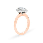 This is our rendition of a classically romantic setting. The brilliance of your centre stone is enhanced by a series of individually handset pavé diamonds. Carefully designed to sit at a perfect height on your finger and flush with your matching wedding ring, our signature finely sculpted wire basket flows seamlessly toward the underside of the halo, drawing in light so your diamond shines bright. Handmade in 9ct or 18ct rose and white gold.