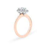 This is our rendition of a classically romantic setting. The brilliance of your centre stone is enhanced by a series of individually handset pavé diamonds. Carefully designed to sit at a perfect height on your finger and flush with your matching wedding ring, our signature finely sculpted wire basket flows seamlessly toward the underside of the halo, drawing in light so your diamond shines bright. Handmade in 9ct or 18ct rose and gold.