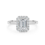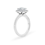 This is our rendition of a classically romantic setting. The brilliance of your centre stone is enhanced by a series of individually handset pavé diamonds. Carefully designed to sit at a perfect height on your finger and flush with your matching wedding ring, our signature finely sculpted wire basket flows seamlessly toward the underside of the halo, drawing in light so your diamond shines bright. Handmade in 9ct or 18ct white gold.