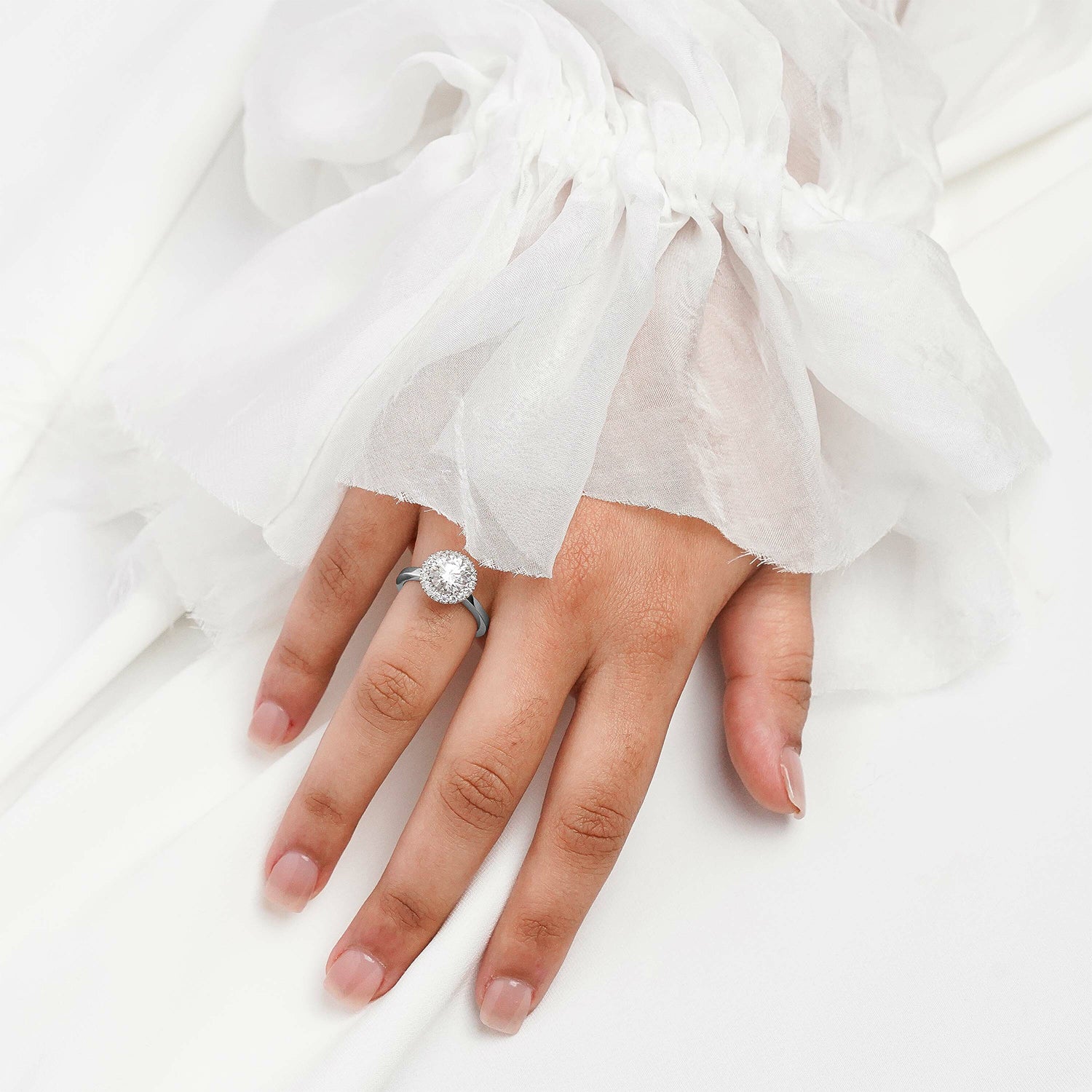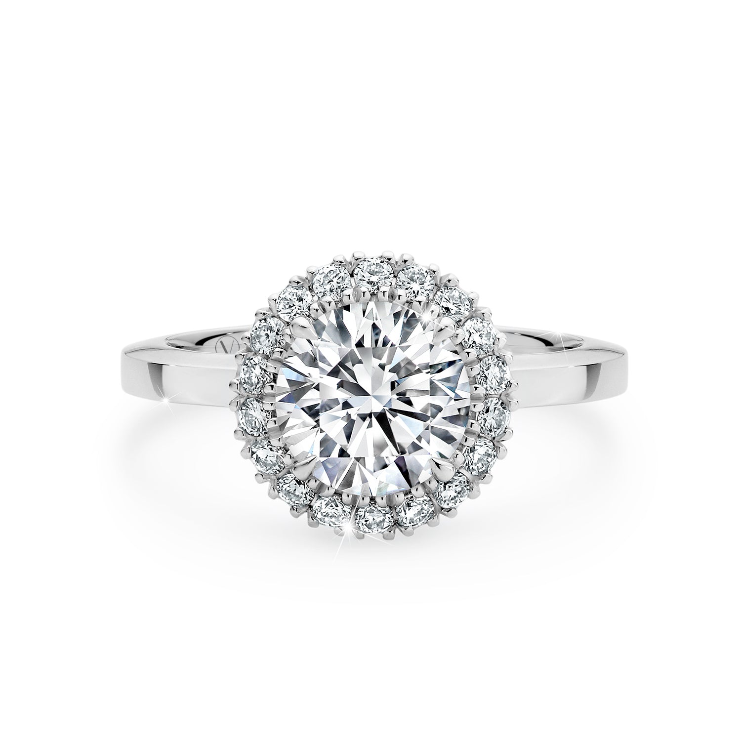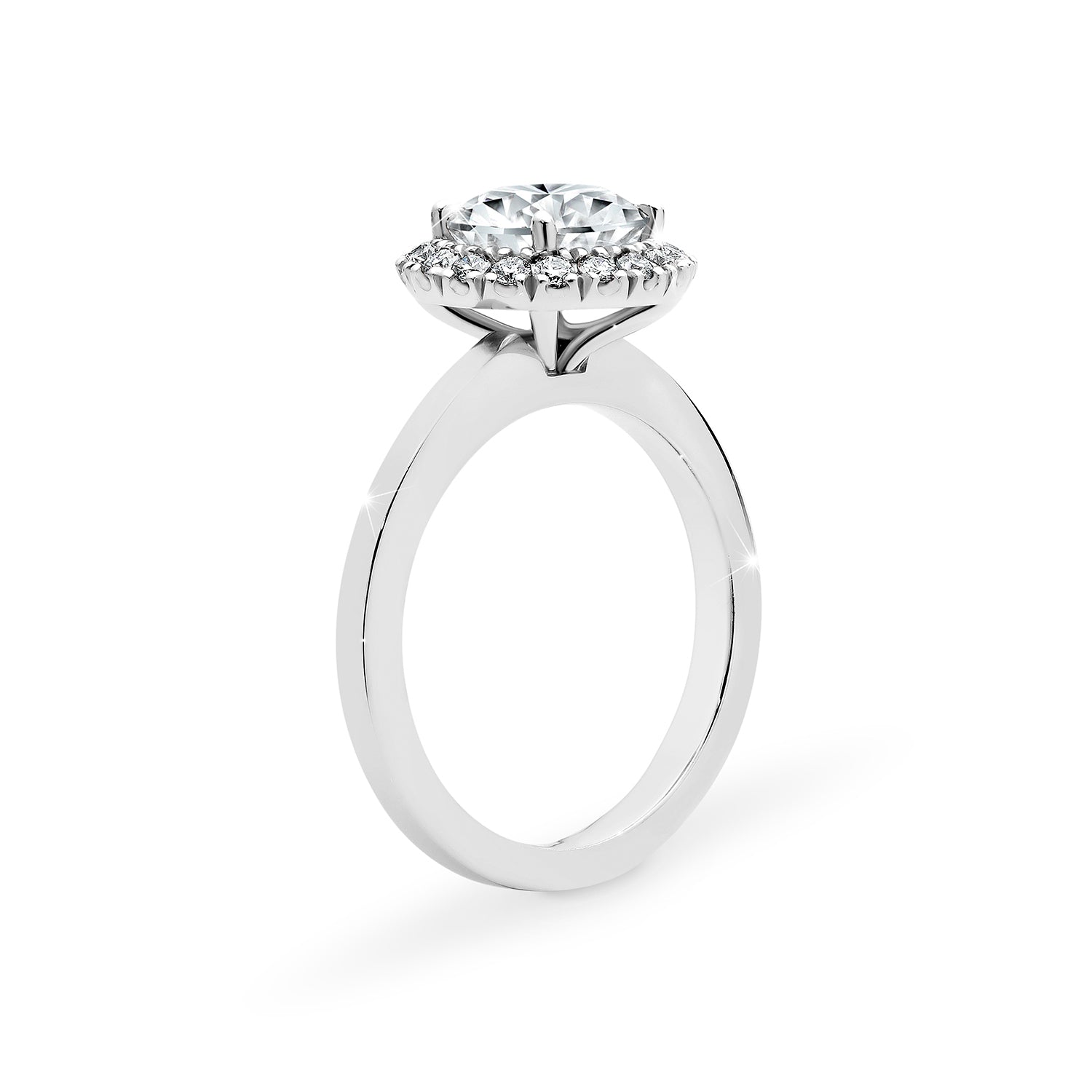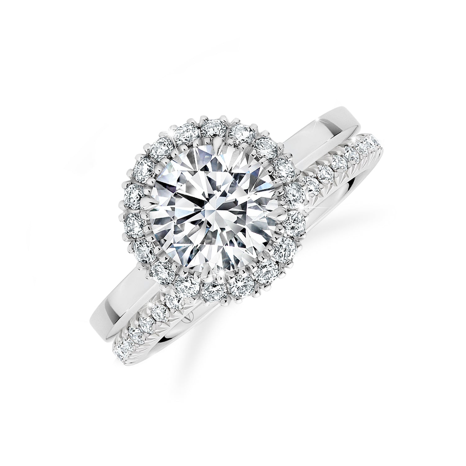 This is our rendition of a classically romantic setting. The brilliance of your centre stone is enhanced by a series of individually handset pavé diamonds. Carefully designed to sit at a perfect height on your finger and flush with your matching wedding ring, our signature finely sculpted wire basket flows seamlessly toward the underside of the halo, drawing in light so your diamond shines bright. Handmade in platinum 950.