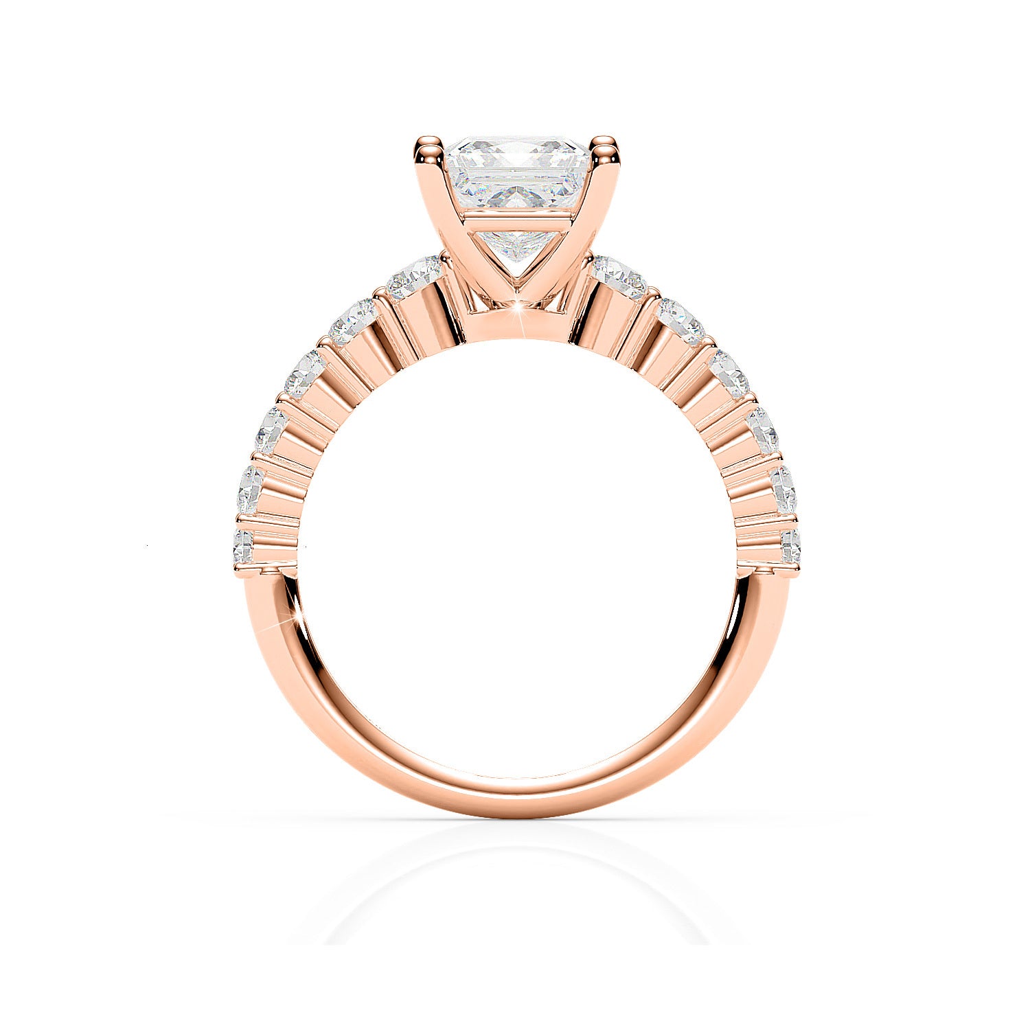 Introducing our exquisite BROOKLYN Setting, a masterpiece of craftsmanship and elegance. This sophisticated setting features a stunning central princess cut diamond, securely held in place by four delicately beaded claws, allowing its brilliance to captivate admirers. Crafted with meticulous attention to detail, the ring boasts 12 graduating diamonds adorning its shoulders, adding a touch of sparkle and glamour. The sleek design tapers gracefully, culminating in a slender 2.8mm thickness at the top. Handmade in 9ct or 18ct rose gold.