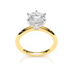 This beautiful setting features a dazzling round brilliant cut diamond held in place by six pear shaped claws and a hidden halo. All elegantly set on a 2mm wide rounded band. Handmade in 9ct or 18ct yellow and white gold.