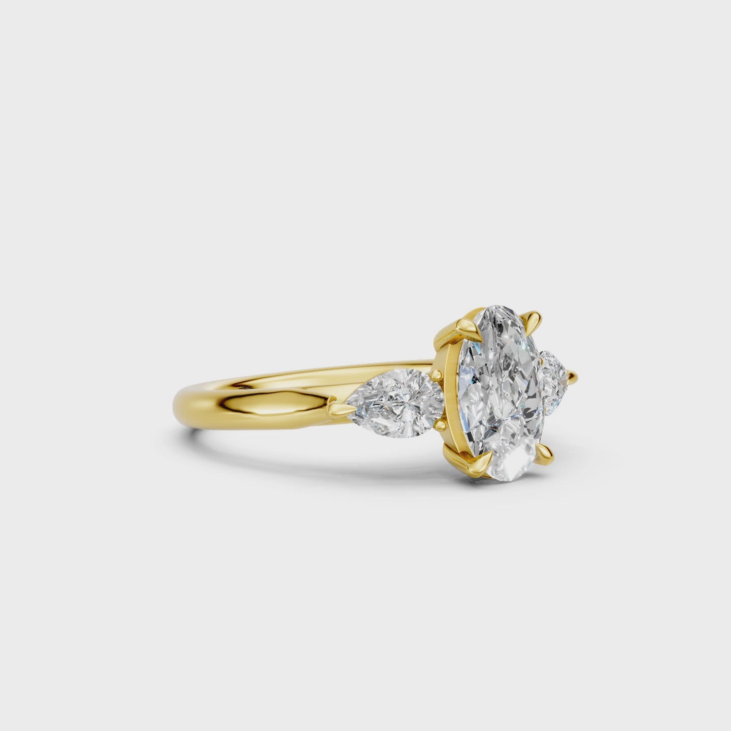 A refined three stone design built around an oval shape centre diamond, secured in a clean four-claw basket that allows plenty of light to enter from the sides. Flanking the centre are two pear-shaped diamonds (0.30ct each), angled to follow the flow of the band and add an elegant spread across the finger. The setting is designed to allow a wedding band to sit flush alongside it, with cathedral shoulders and an open gallery for a balanced, elevated finish. Handmade in 9ct or 18ct yellow gold.
