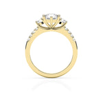 This exquisite three stone ring setting is designed to showcase a round brilliant-cut central stone, flanked by two perfectly balanced side diamonds. The setting is further adorned with eight smaller diamond accents along the shoulders, adding a touch of elegance and sparkle from every angle. Handmade in 9ct or 18ct yellow gold.