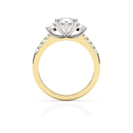 This exquisite three stone ring setting is designed to showcase a round brilliant-cut central stone, flanked by two perfectly balanced side diamonds. The setting is further adorned with eight smaller diamond accents along the shoulders, adding a touch of elegance and sparkle from every angle. Handmade in 9ct or 18ct yellow and white gold.
