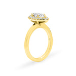 This is our rendition of a classically romantic setting. The brilliance of your centre stone is enhanced by a series of individually handset pavé diamonds. Carefully designed to sit at a perfect height on your finger and flush with your matching wedding ring, our signature finely sculpted wire basket flows seamlessly toward the underside of the halo, drawing in light so your diamond shines bright. Handmade in 9ct or 18ct yellow gold.