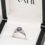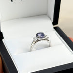 This three stone ring features an incredibly beautiful cushion cut tanzanite with a tw. of 1.86ct and 2 x F/SI1 princess cut white diamonds with a tw. of 0.36ct on either side. Handmade in 18ct white gold.