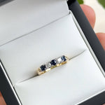 A delicate five stone ring featuring three blue ceylon sapphires with a tw. of 0.43ct and two F/SI1 natural white diamonds with a tw. of 0.22ct. Handmade in 18ct yellow and white gold.