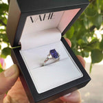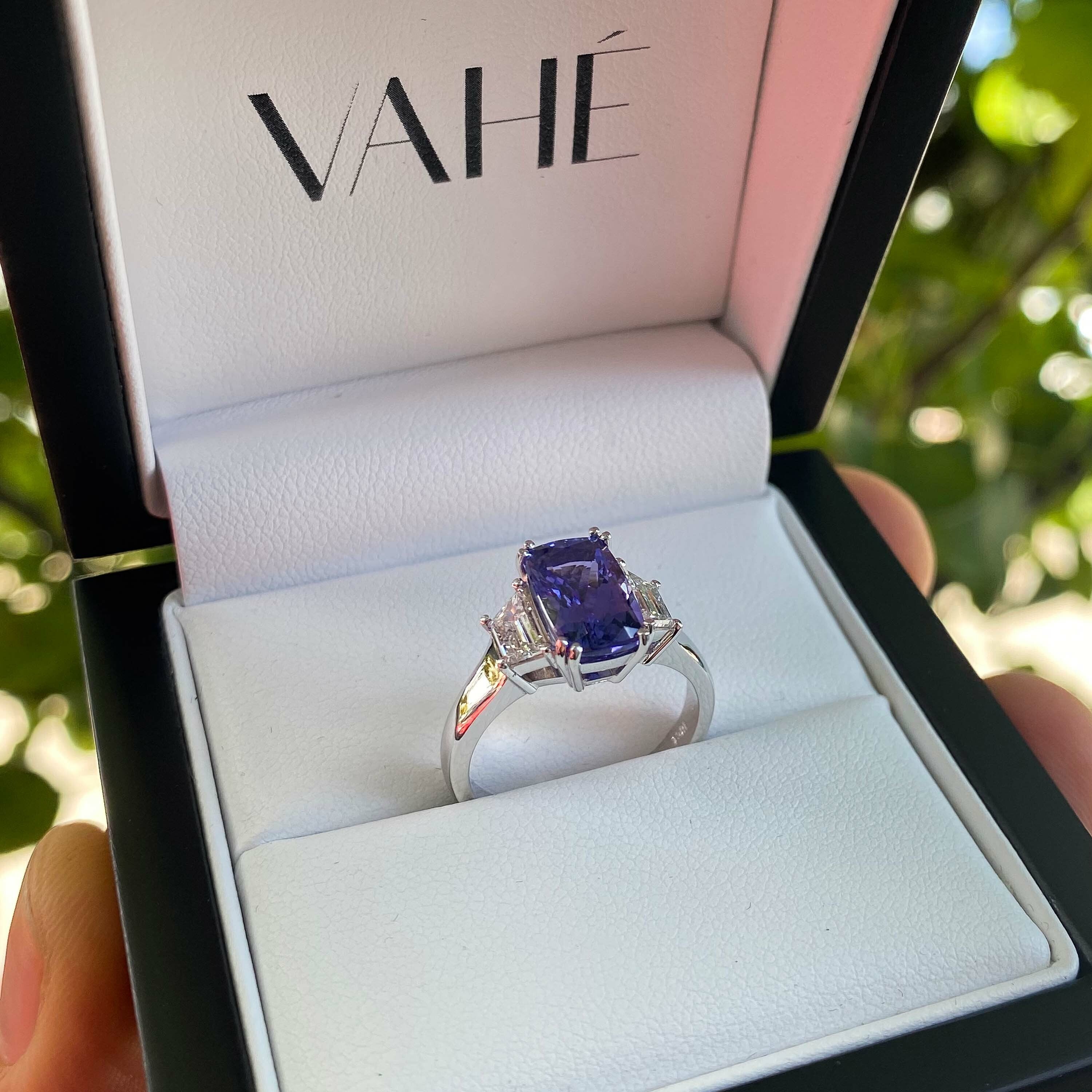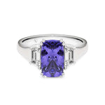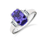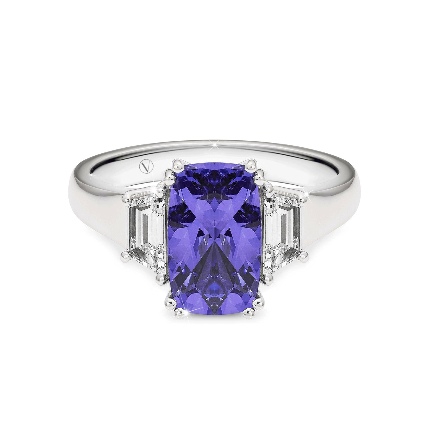 This three stonering features an incredibly beautiful purple blue elongated cushion shape tanzanite with a tw. of 2.59ct. On either side are two F/VS trapezoid cut natural white diamonds with a total weight of 0.59ct. Handmade in 18ct white gold.