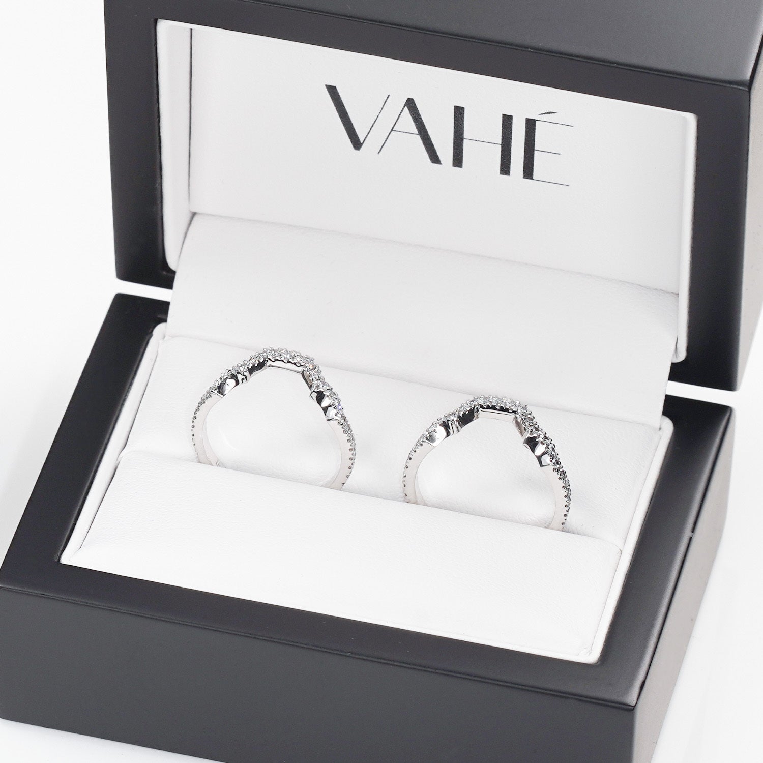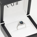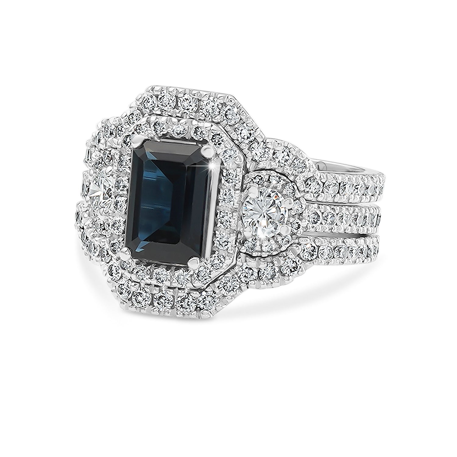This beautiful set is a stunning example of vintage inspired design, featuring two matching fitted diamond set wedding rings that flow around the profile of the engagement ring on either side. The engagement ring showcases a gorgeous emerald cut australian sapphire, which is expertly set in an antique art deco halo design and encrusted with sparkling white diamonds. Handmade in 18ct white gold.