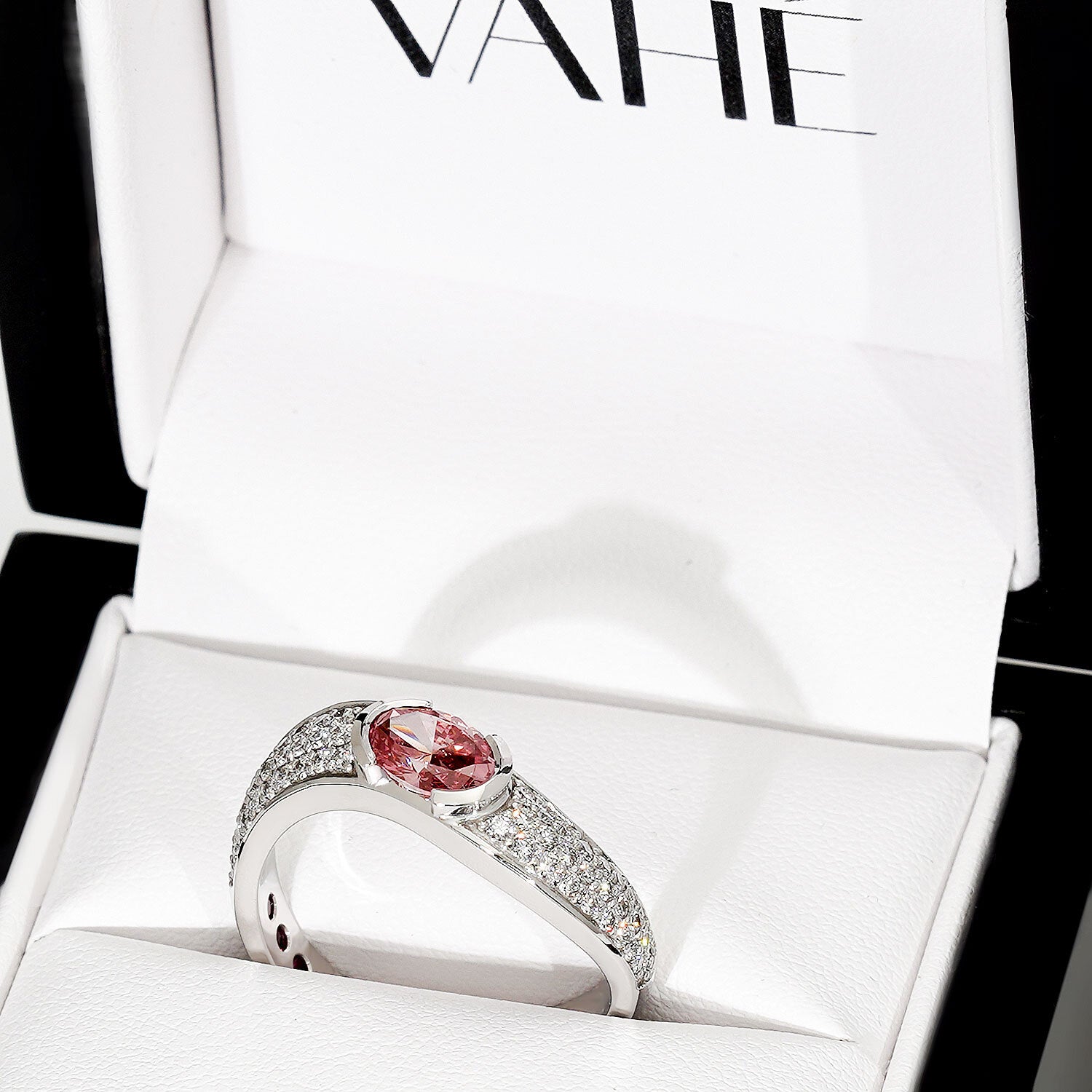 A striking blend of elegance and modern design this custom ring showcases a 0.85ct vivid pink oval shaped lab grown diamond, set horizontally for a contemporary twist. Micro pavé-set white diamond accents of graduating dimensions gracefully flank the central stone enhancing its brilliance. Handcrafted in lustrous 18ct white gold, this design epitomizes refined craftsmanship and timeless beauty. Perfect for those seeking a unique statement piece.