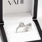 A ring featuring a GIA certified F/VS1 marquise cut natural diamond with a tw. of 0.77ct at its centre. Surrounding the central stone and adorning the shoulders are scalloped pave set F/VS round brilliant cut natural diamonds with a tw. of 0.41ct. Handmade in 18ct white gold.