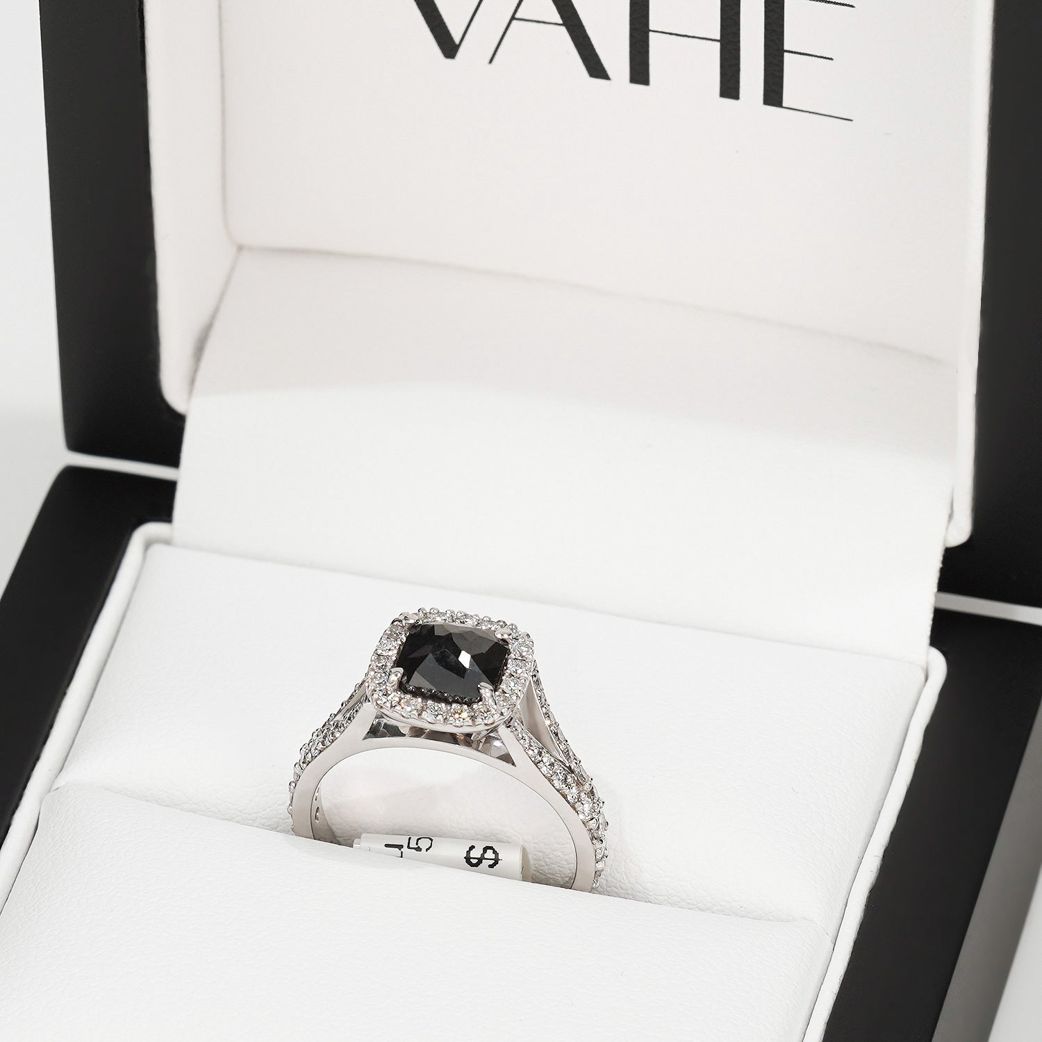 A stunning ring featuring a reverse set cushion cut natural black diamond with a tw. of 0.97ct at its centre. Surrounding the central stone and adorning the shoulders are grain set G/SI1 round brilliant cut natural diamonds with a tw. of 0.61ct. Handmade in 18ct white gold.