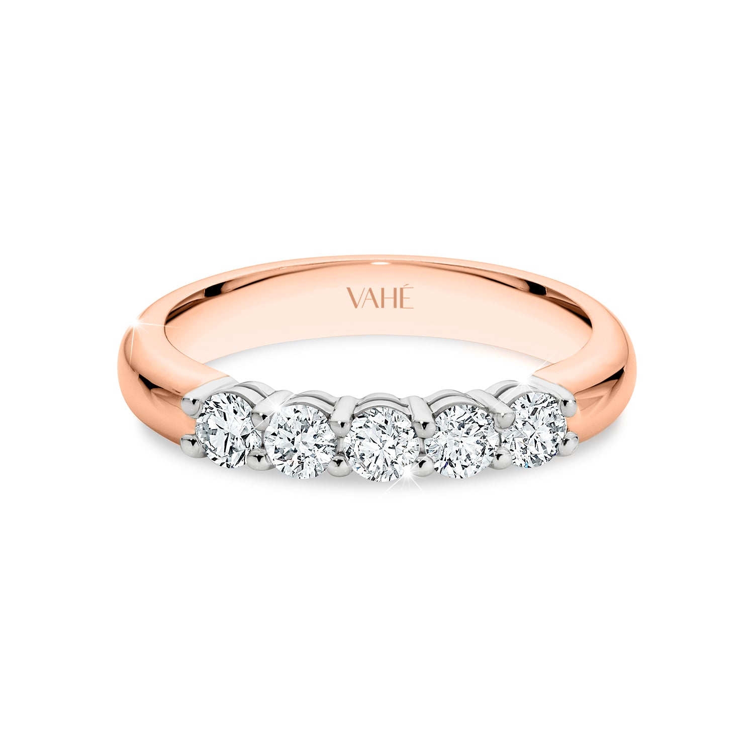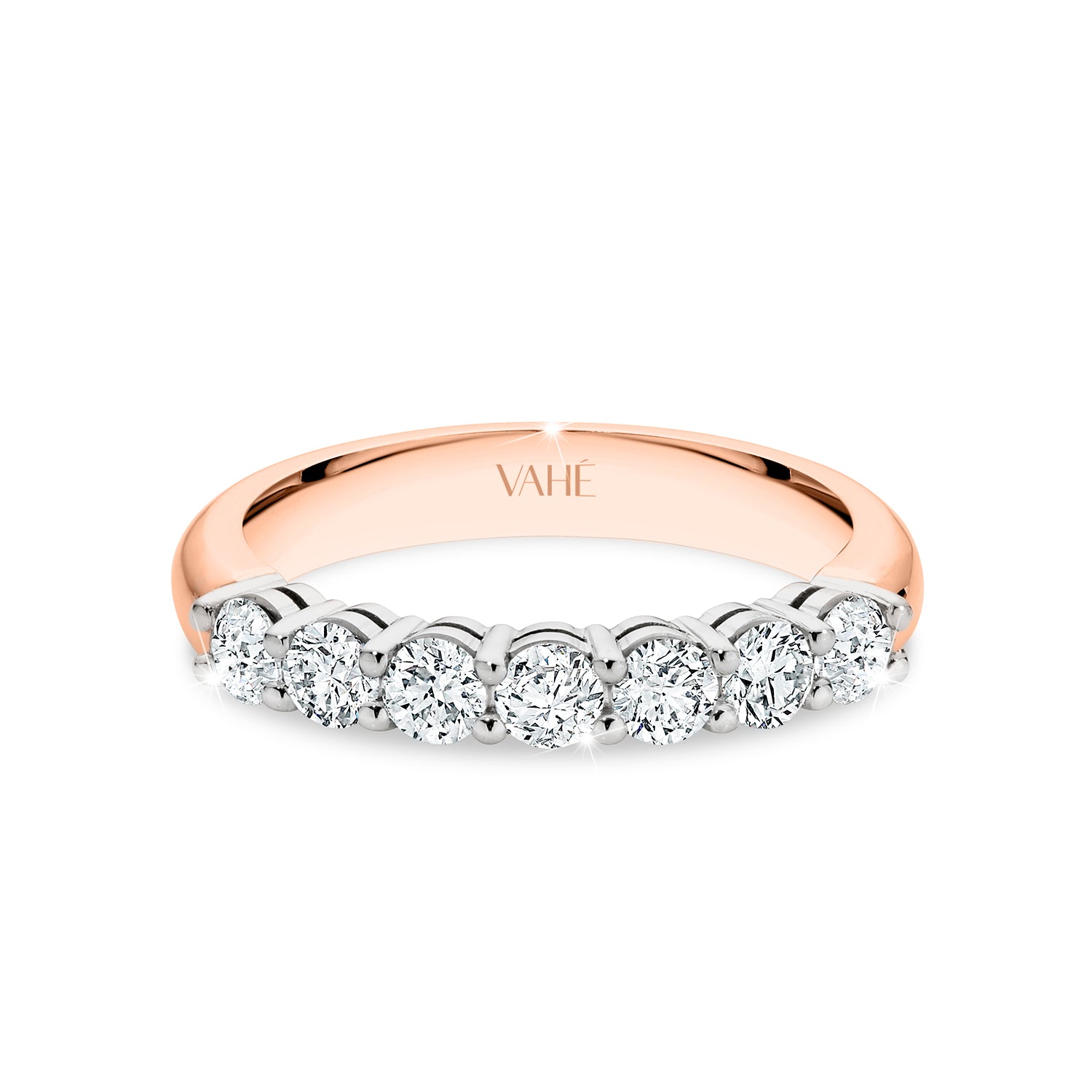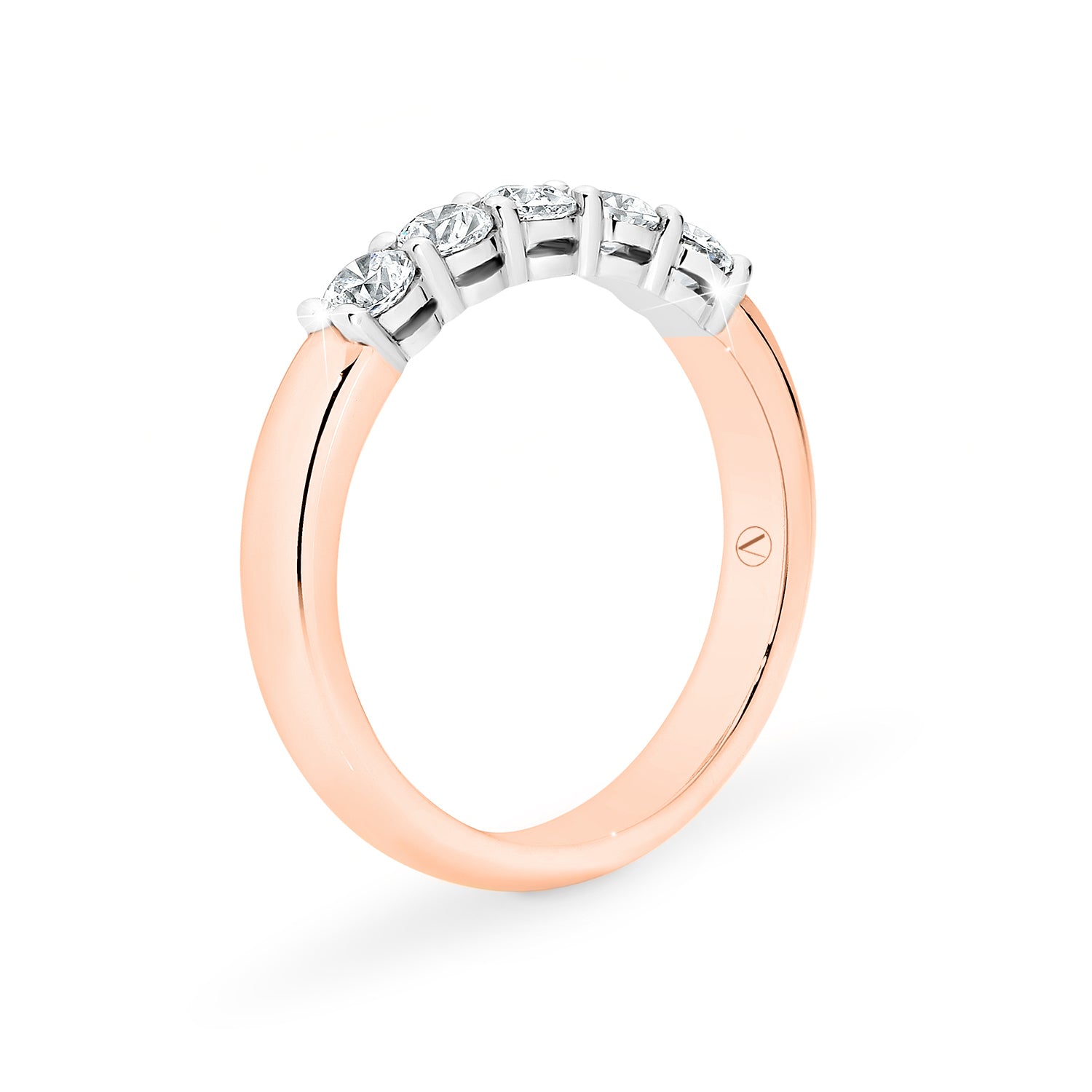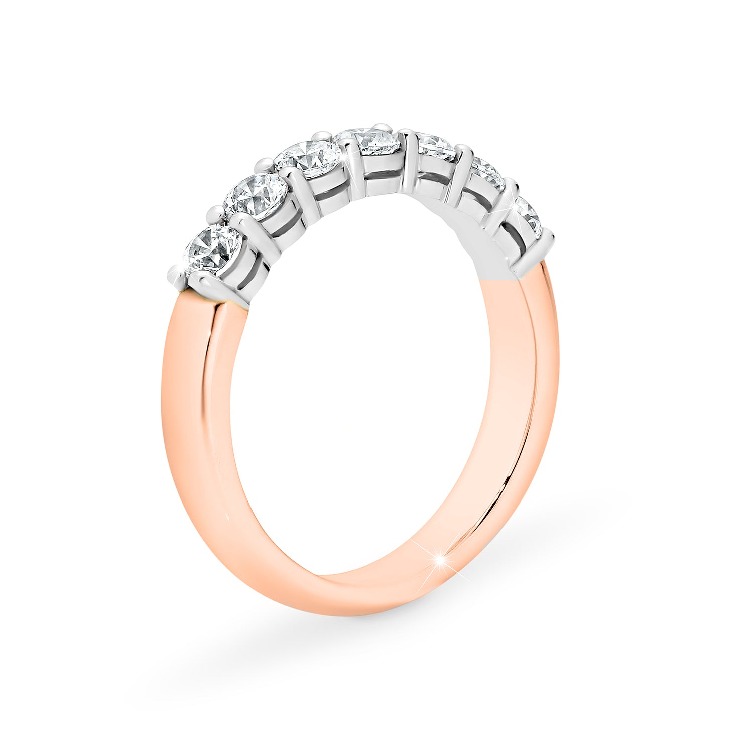 A timeless design that symbolises a lasting love. This beautiful diamond ring graces the finger with sparkling round-brilliant cut diamonds set in delicately sculpted shared prongs. The ring features a double base for added strength, a classic half round band, and is available in 5 or 7 stone variations. Handmade in 9ct or 18ct rose and white gold.