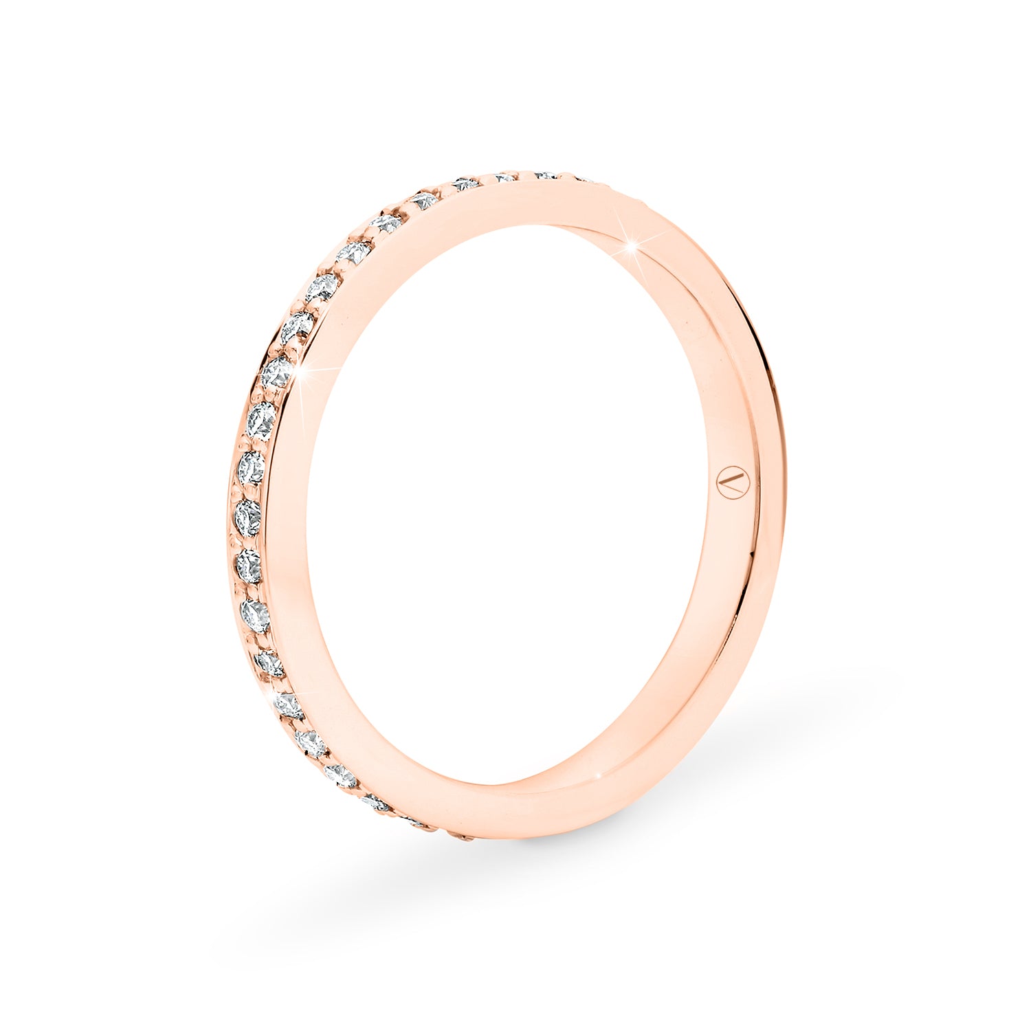 An exquisite bead & bright-cut wedding ring set with 0.42ct tw. of round brilliant cut diamonds extending all the way around the band. A compliment too many engagement rings or perfect as an anniversary ring. Handmade in either 9ct or 18ct rose gold.