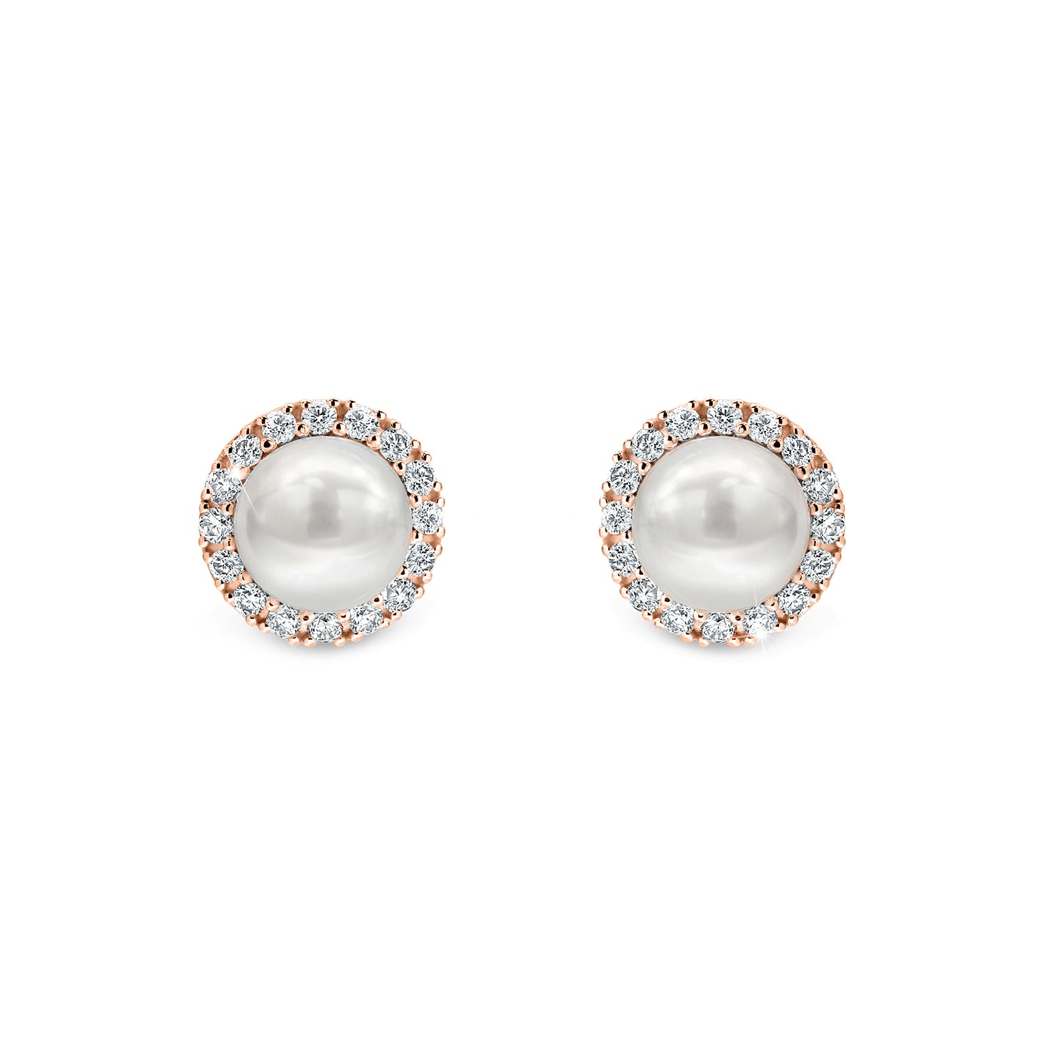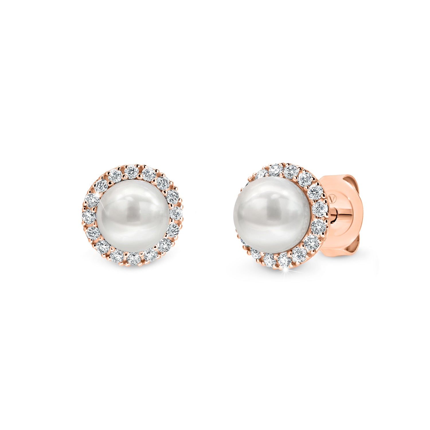 These beautiful pearl earrings add a touch of class to any occasion. Featuring two 6mm Japanese Akoya cultured pearls, hand picked for their gorgeous luster and surface. The pearls are surrounded by a stunning halo of round-brilliant cut diamonds. Handmade in 9ct or 18ct rose gold.