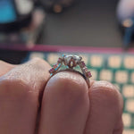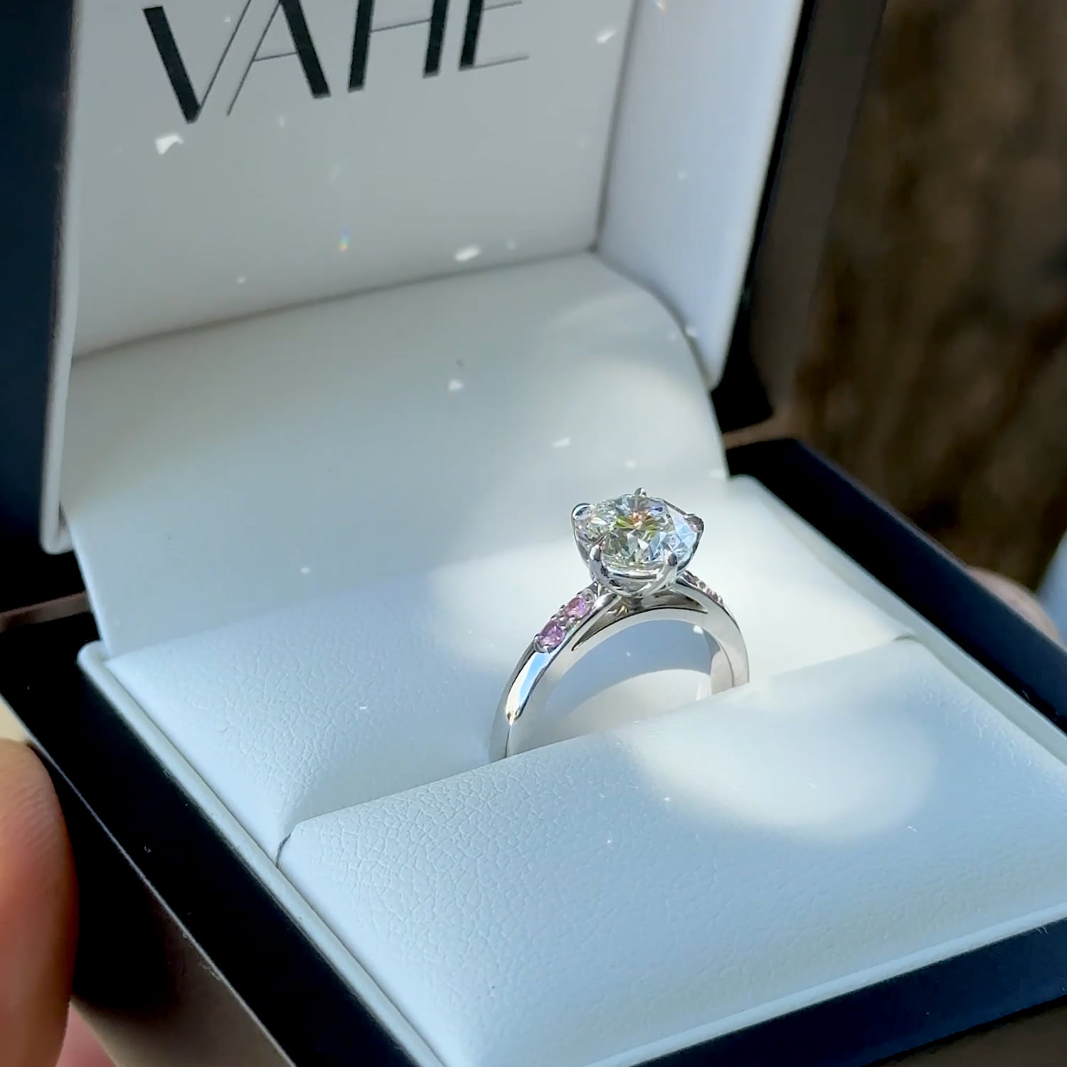 This piece was created by carefully transforming our client’s existing engagement ring into a fresh, modern design. We reset their centre round brilliant-cut lab grown diamond and repurposed four beautiful pink sapphires, giving each stone a new life in a timeless platinum setting.
