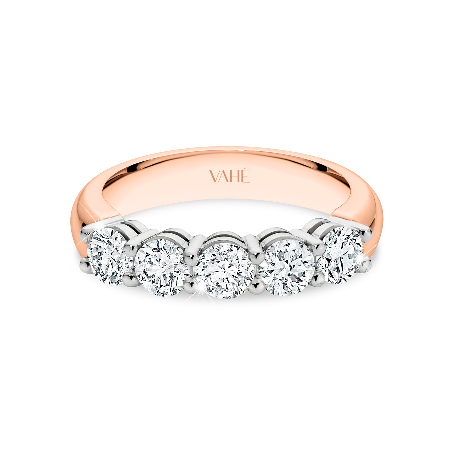 A timeless design that symbolises a lasting love. This beautiful diamond ring graces the finger with 5 sparkling round-brilliant cut diamonds with a tw. of 1.25ct set in delicately sculpted shared prongs. The ring features a double base for added strength and a classic half round band. Handmade in 9ct or 18ct rose and white gold.