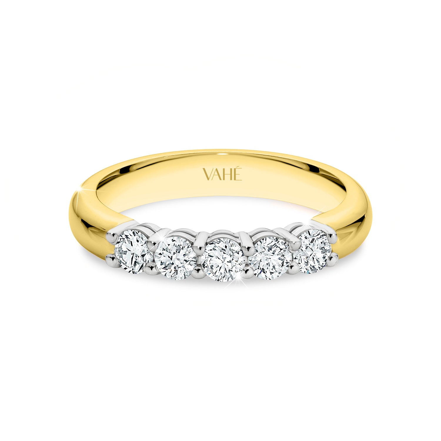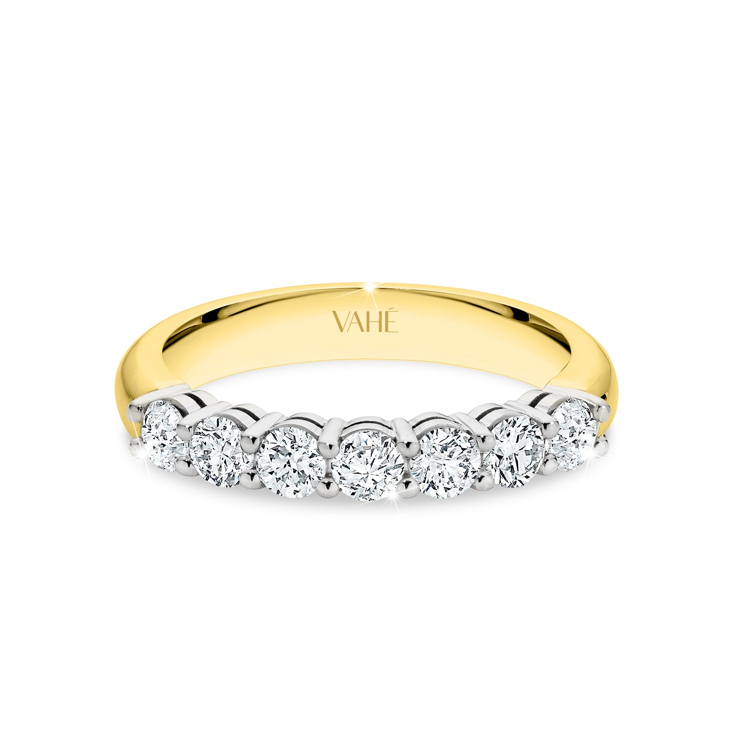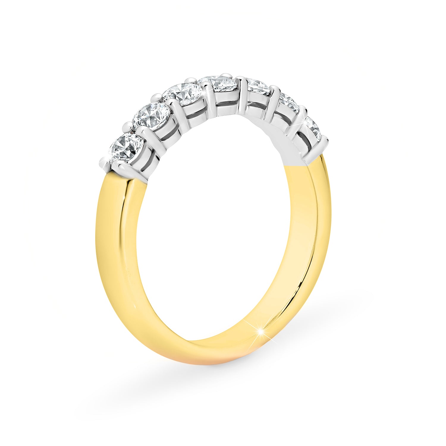 A timeless design that symbolises a lasting love. This beautiful diamond ring graces the finger with sparkling round-brilliant cut diamonds set in delicately sculpted shared prongs. The ring features a double base for added strength, a classic half round band, and is available in 5 or 7 stone variations. Handmade in 9ct or 18ct yellow and white gold.
