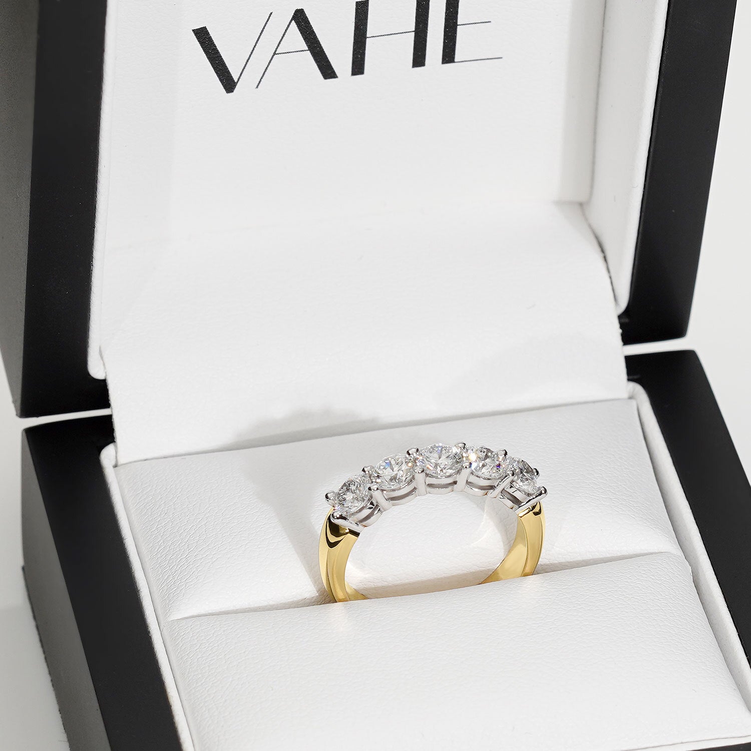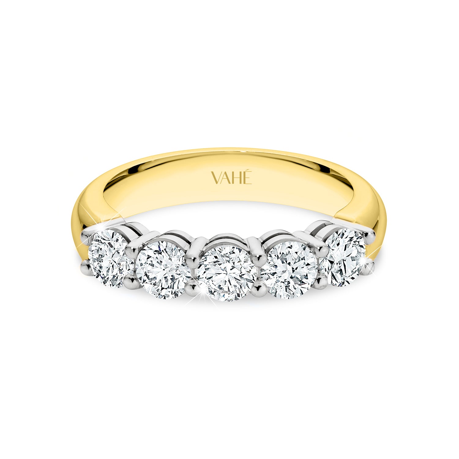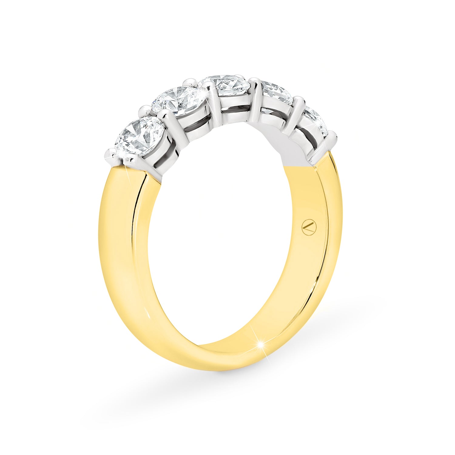 A timeless design that symbolises a lasting love. This beautiful diamond ring graces the finger with 5 sparkling round-brilliant cut diamonds with a tw. of 1.25ct set in delicately sculpted shared prongs. The ring features a double base for added strength and a classic half round band. Handmade in 9ct or 18ct yellow and white gold.