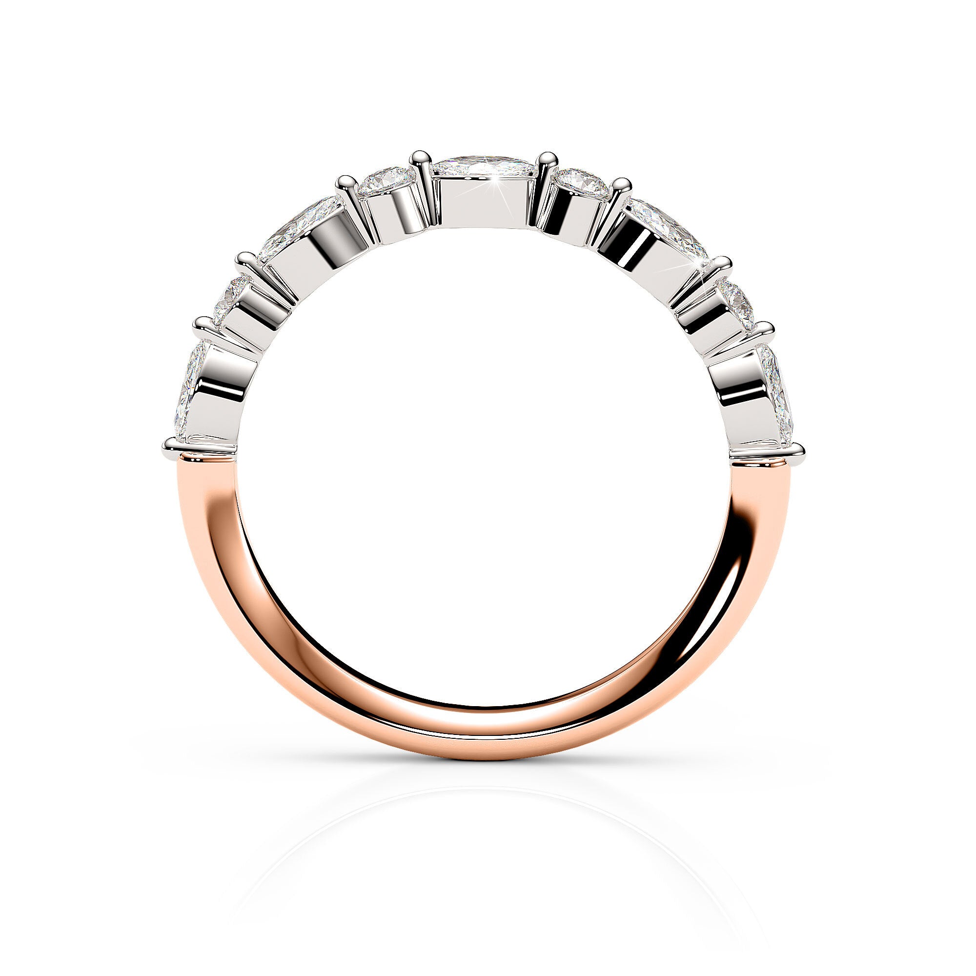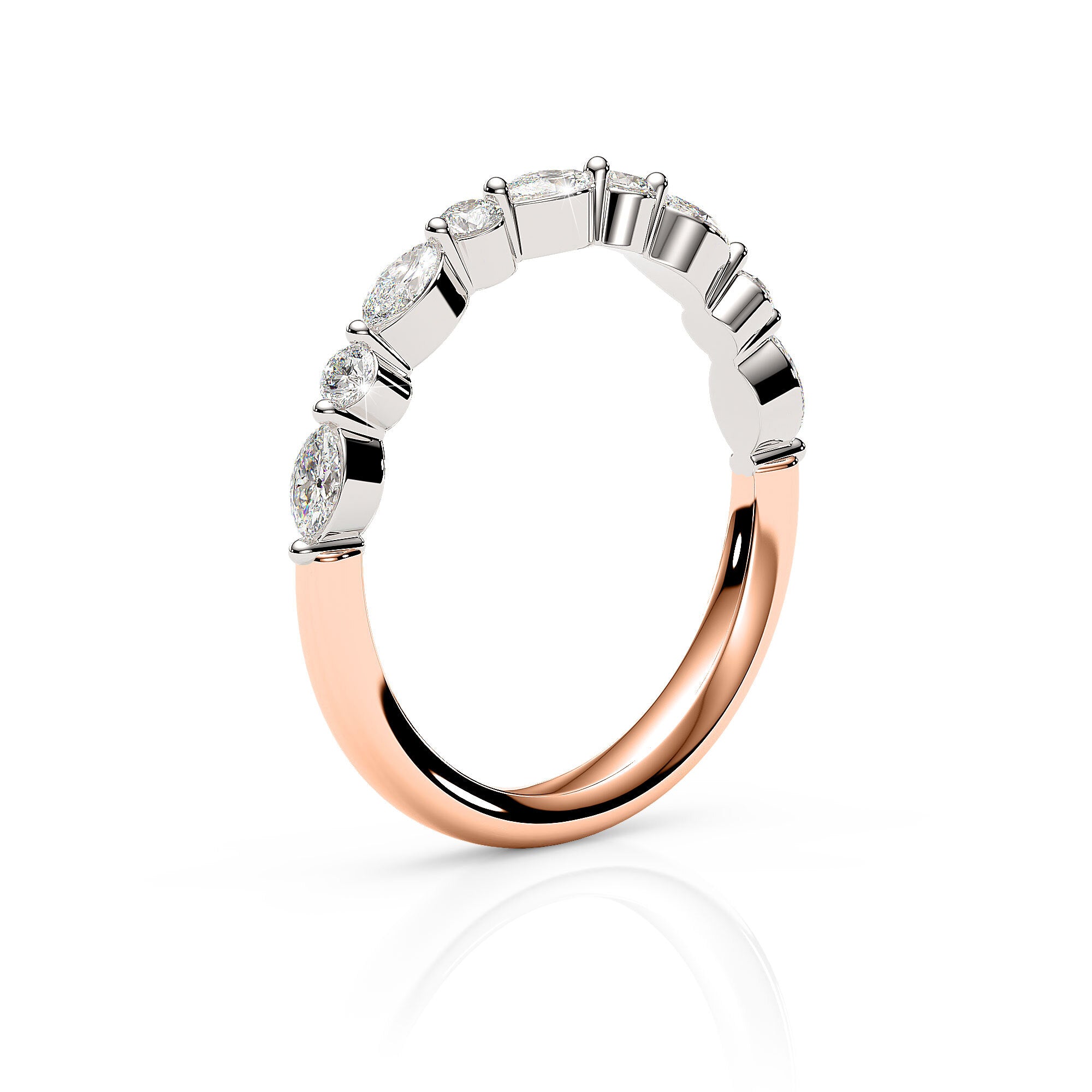 Indulge in the captivating allure of this beautiful ring, where alternating round and marquise diamonds converge to form a mesmerising pattern across its stylish facade. The ring features a calibrated arrangement of 5 stunning marquise diamonds accompanied by 4 round brilliant diamonds. The blend of shapes make this ring perfect for making a statement on any occasion. Handmade in either 9ct or 18ct rose and white gold.