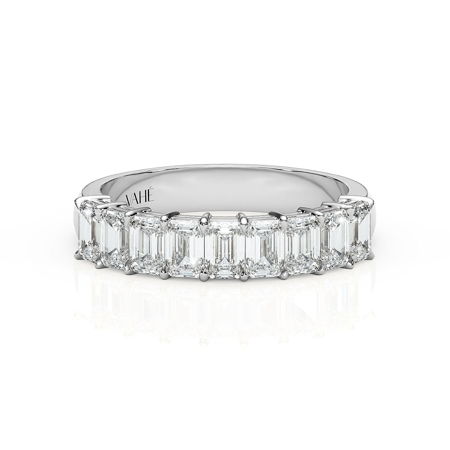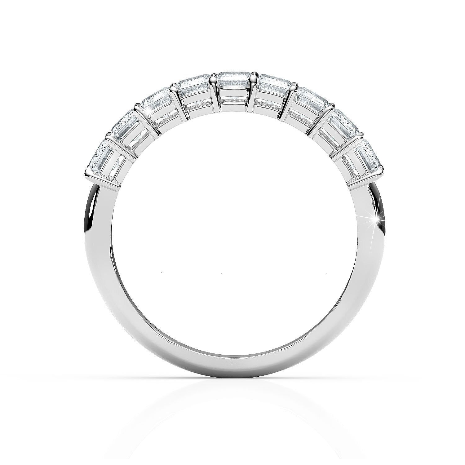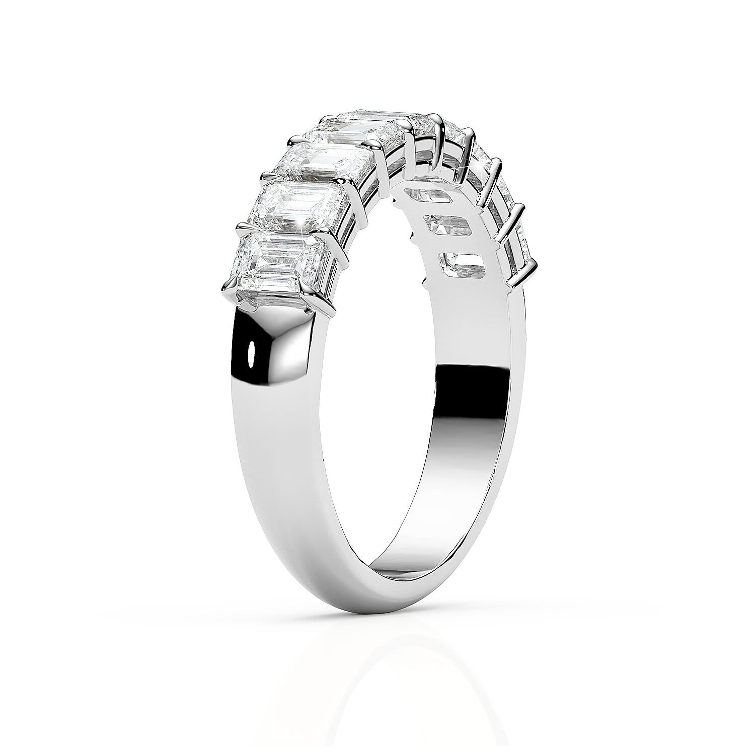 A stunning nine stone emerald cut diamond ring, a true testament to elegance and sophistication. Each diamond is carefully secured by pear shaped shared prongs, accentuating the natural elongation of an emerald cut diamond. Beneath this dazzling array, a double base provides both strength and a distinctive aesthetic touch. Handmade in platinum 950.