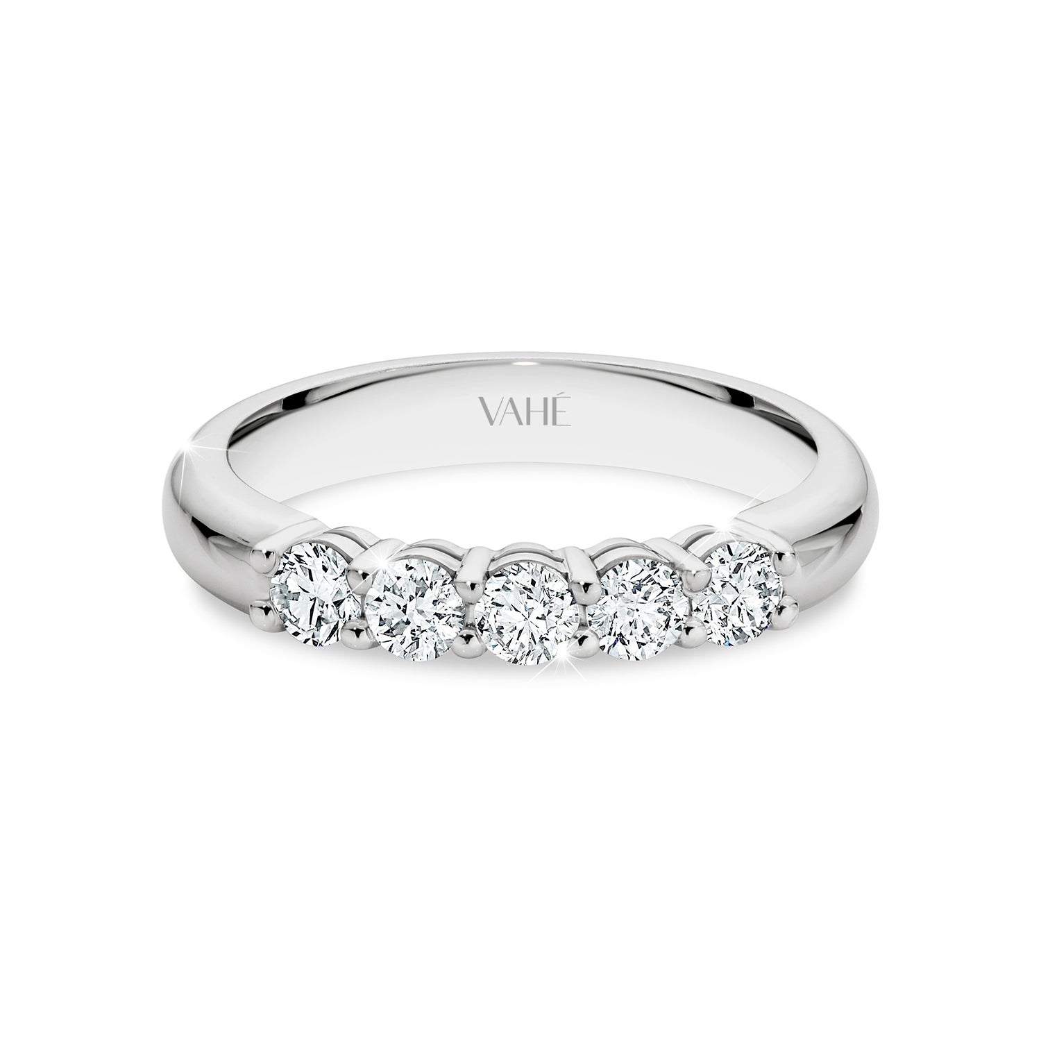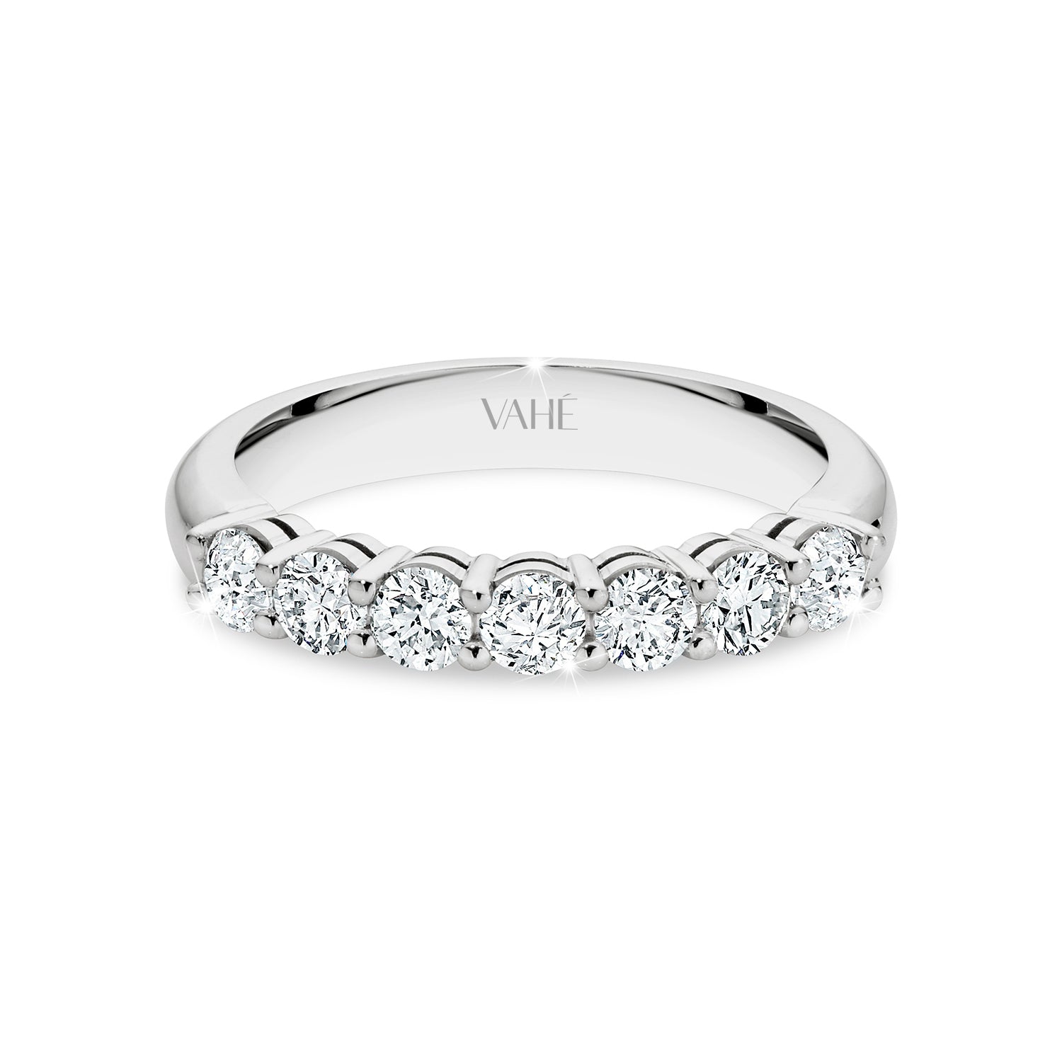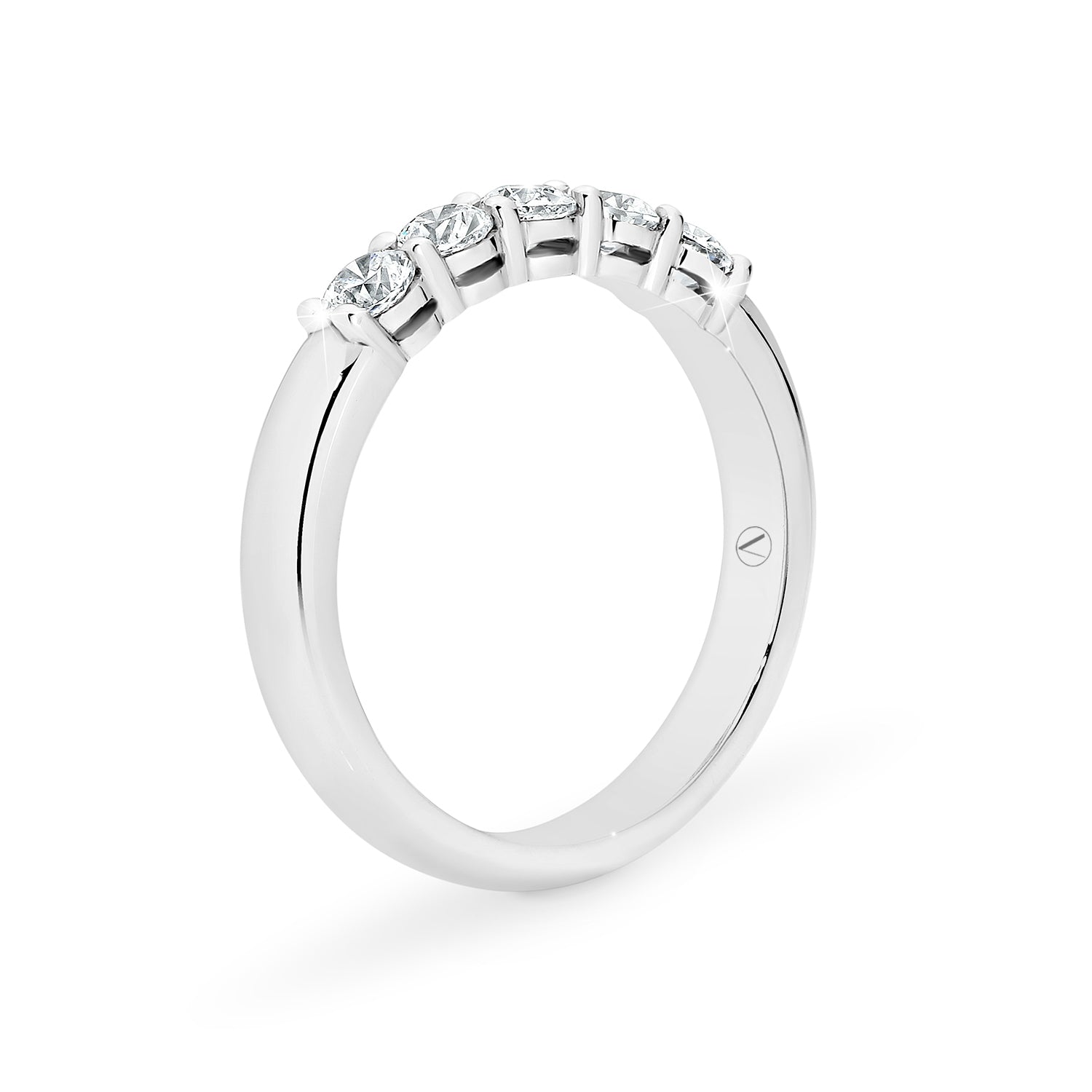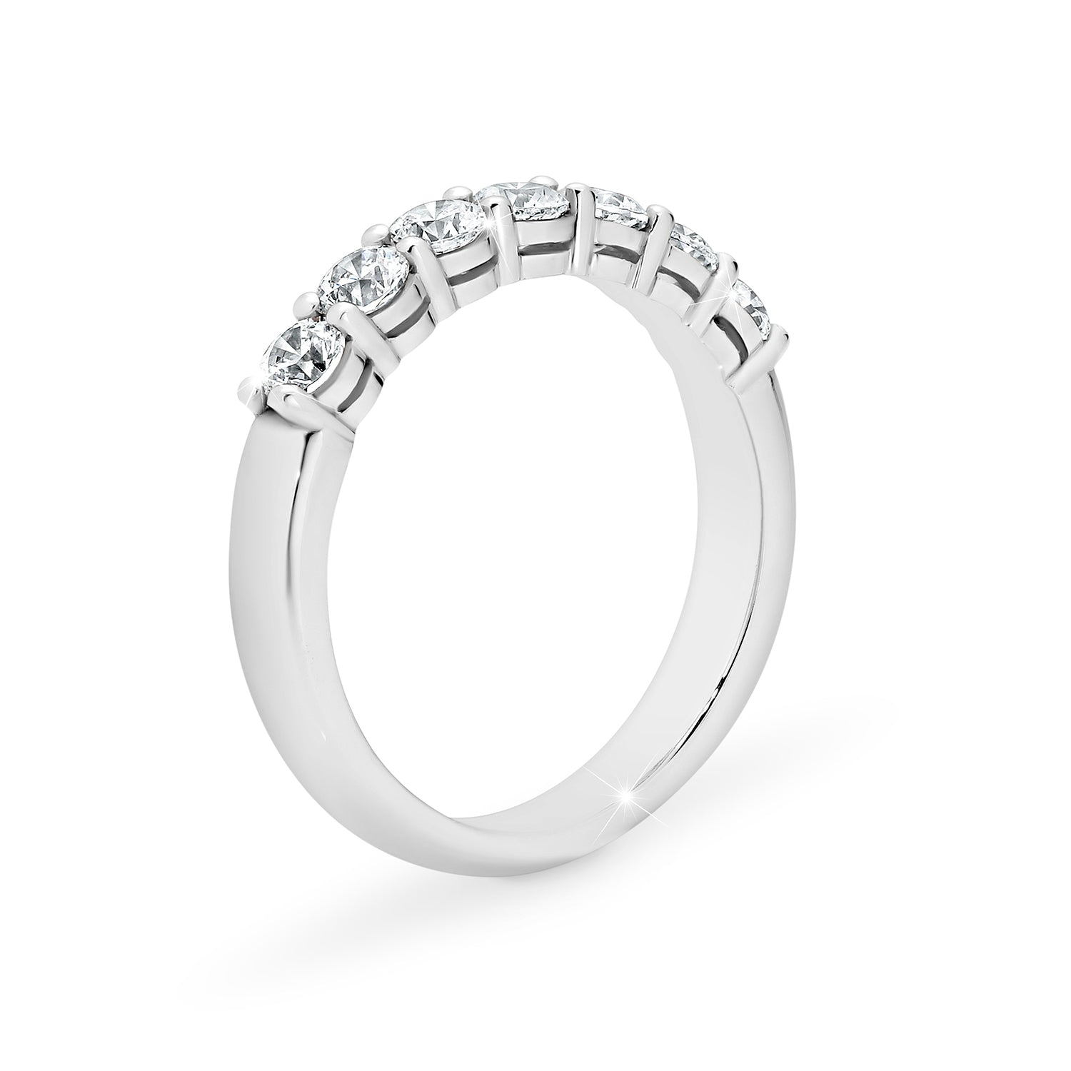 A timeless design that symbolises a lasting love. This beautiful diamond ring graces the finger with sparkling round-brilliant cut diamonds set in delicately sculpted shared prongs. The ring features a double base for added strength, a classic half round band, and is available in 5 or 7 stone variations. Handmade in platinum 950.