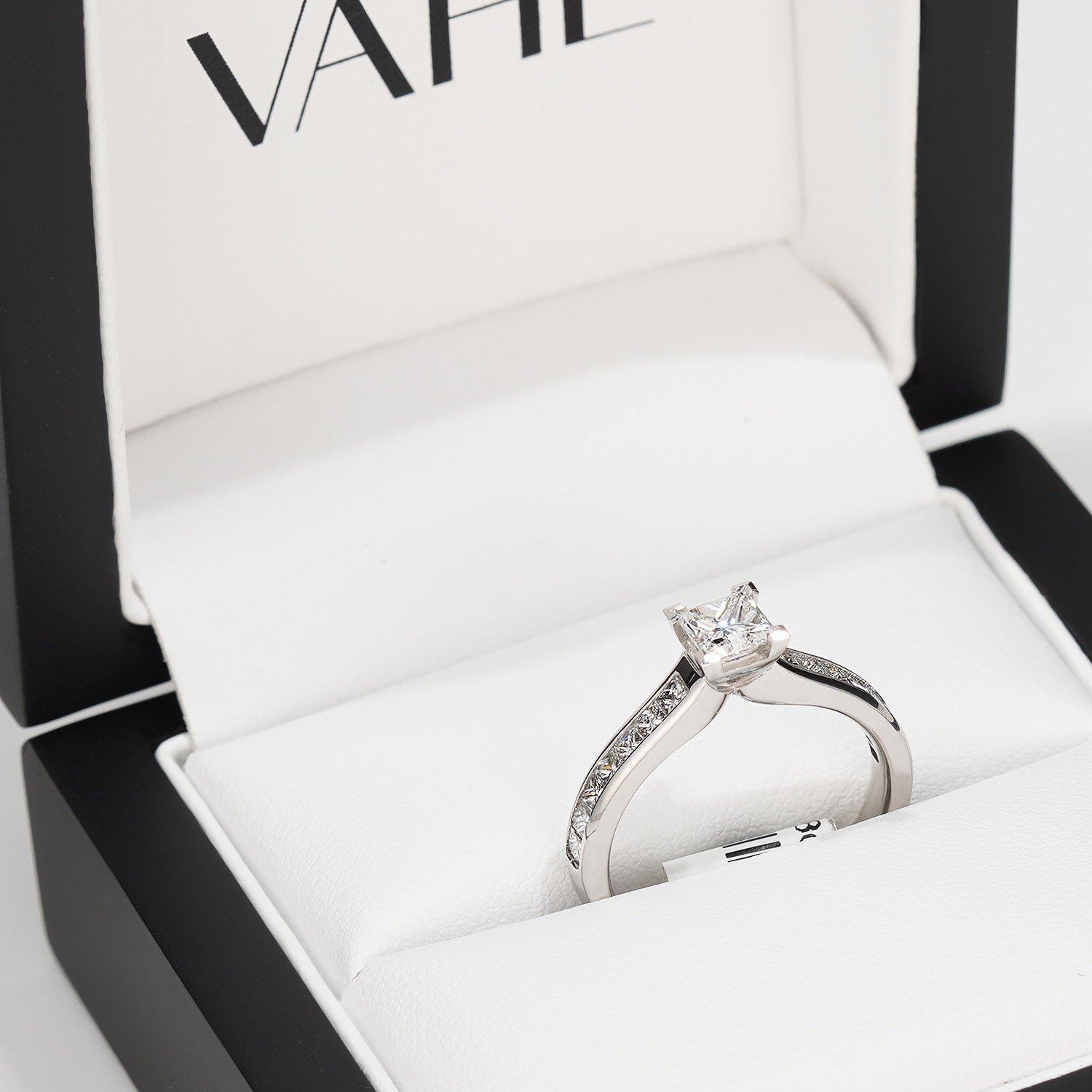 Princess Cut Solitaire with Channel Set Shoulders in 18ct White Gold