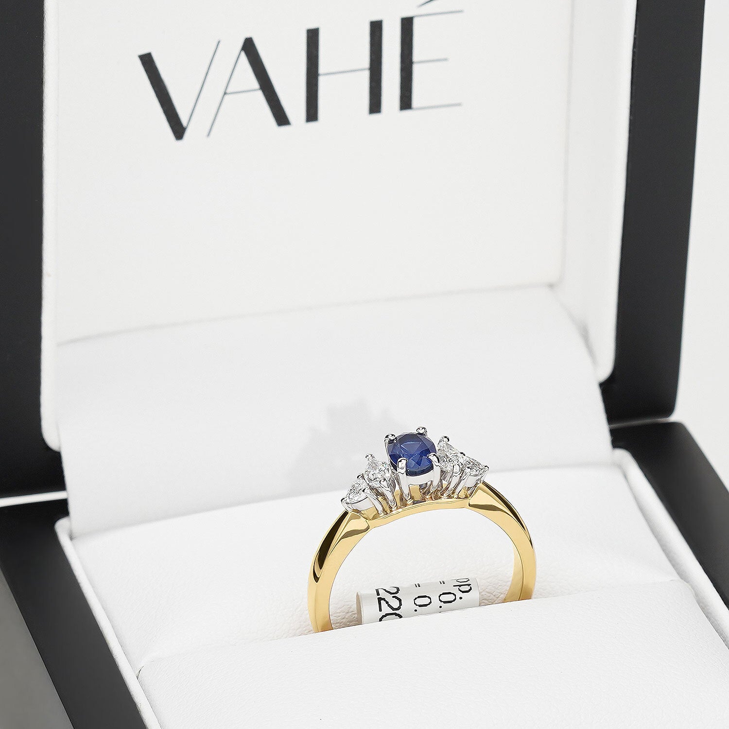A beautiful ring featuring an oval shape sapphire with a tw. of 0.58ct at its centre. On either side are matching calibrated G/SI1 marquise and trilliant cut diamonds with a total weight of 0.31ct. Handmade in 18ct yellow and white gold.