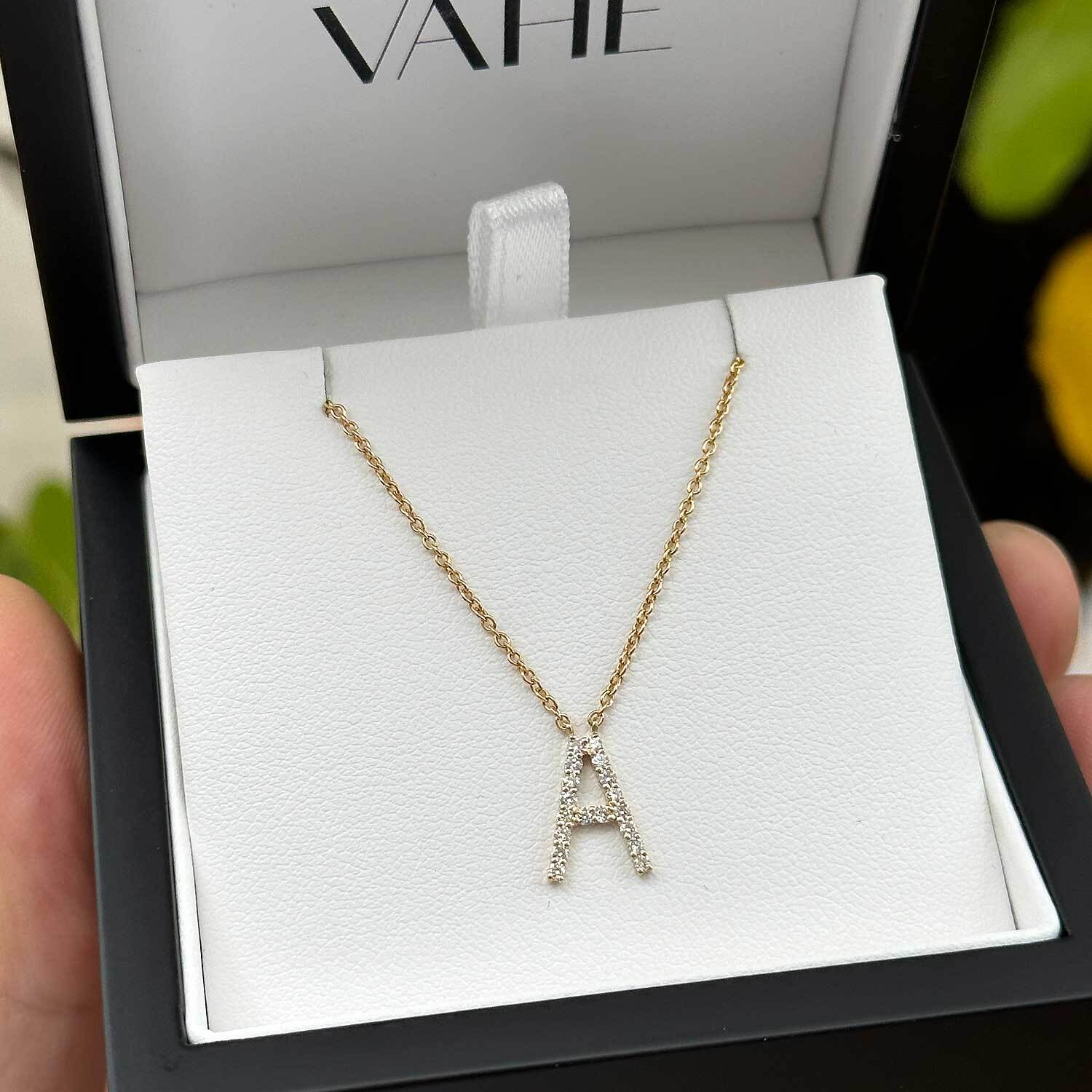 A delicate "A" initial pendant set with 18 x G/VS round brilliant cut natural white diamonds with a tw. of 0.18ct. Handmade in 18ct yellow gold. The cable chain that holds the pendant in place is made from 9ct yellow gold.