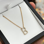 A delicate "B" initial pendant set with 24 x G/VS round brilliant cut natural white diamonds with a tw. of 0.24ct. Handmade in 18ct yellow gold. The cable chain that holds the pendant in place is made from 9ct yellow gold.