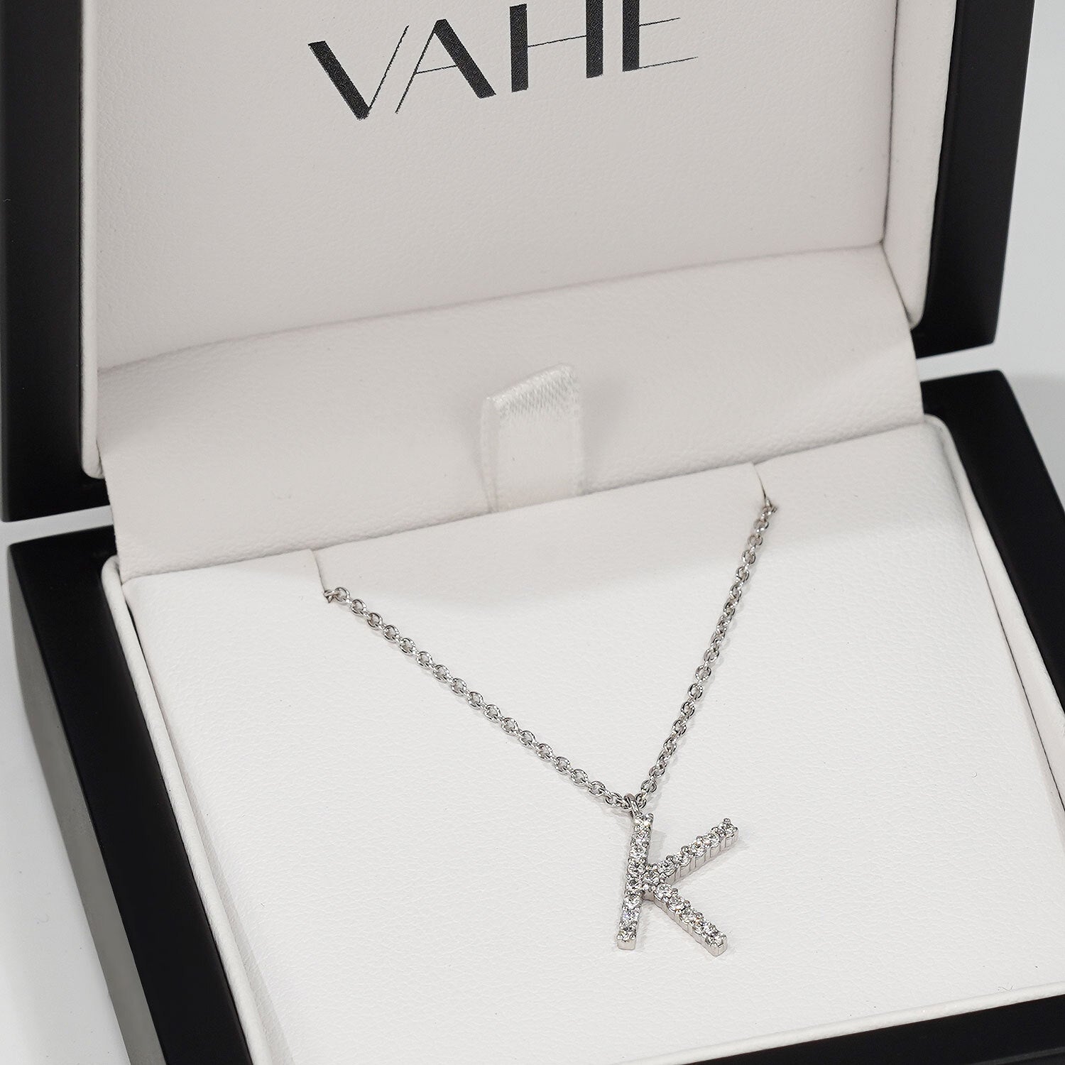A delicate "K" initial pendant set with 19 x G/VS round brilliant cut natural white diamonds with a tw. of 0.19ct. Handmade in 18ct white gold. The cable chain that holds the pendant in place is made from 9ct white gold.