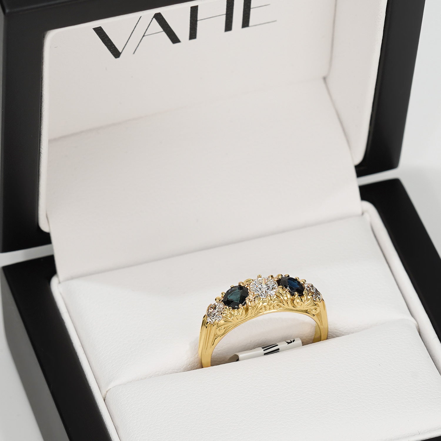 A beautiful antique style five stone ring featuring scroll work on the sides and two sapphires with a tw. of 0.80ct and three F/SI1 natural white diamonds with a tw. of. 0.69ct. Handmade in 18ct yellow gold.