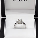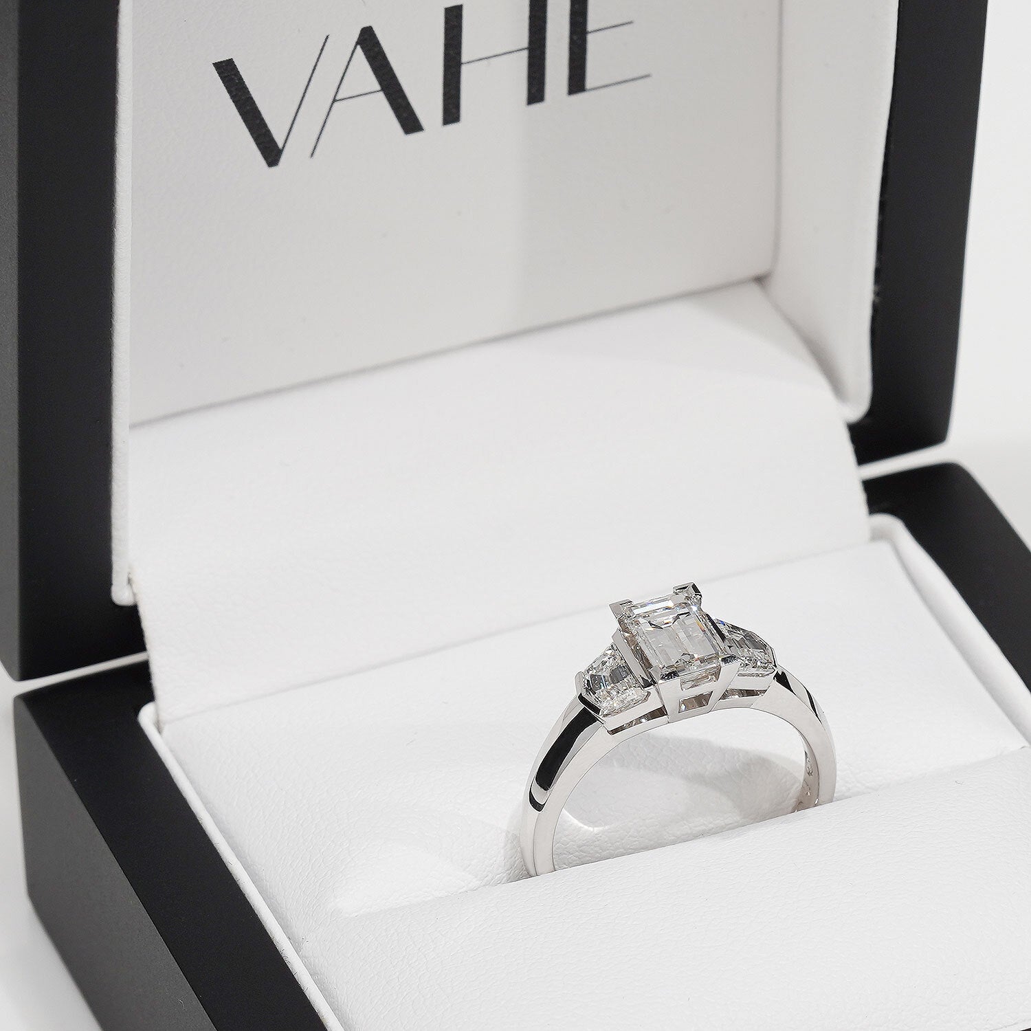 A beautiful three stone ring featuring a GIA certified F/VS2 baguette cut natural diamond with a tw. of 1.01ct at its centre. On either side are two calibrated G/VS1 bullet cut diamonds with a total weight of 0.71ct. Handmade in 18ct white gold.