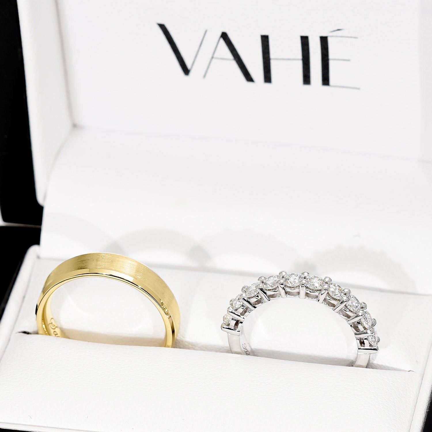 A recently purchased set of wedding rings made for our lovely clients Adrian & Sandra. Sandra's ring is set with 10 x E/VS round brilliant natural-mined diamonds with a total weight of 0.97ct and handmade to fit next to her existing engagement in 18ct white gold. Adrian opted for a 5mm wide bevelled edge ring with a brushed finish and made in 9ct yellow gold.
