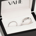 A recently purchased set of wedding rings featuring our ADRIANA and DANIEL designs. ADRIANA is set with 23 x D/VS round brilliant cut lab grown diamonds with a tw. of 0.23ct and handmade in 18ct white gold. DANIEL is 6mm wide and 1.8mm thick, handmade in 9ct white gold.