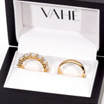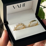 A recently purchased set of wedding rings featuring our JULIA and DANIEL designs. JULIA is set with 7 x D/VS IGI certified round brilliant cut lab grown diamonds with a tw. of 2.25ct and crafted in 18ct yellow gold. DANIEL is 4mm wide and 1.8mm thick, crafted in 18ct yellow gold.