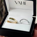 A recently purchased set of wedding rings featuring our LILY and DANIEL designs. LILY is set with alternating round and marquise natural white diamonds boasting a total weight of 0.41 carats and handmade in 18ct white gold. DANIEL is 5mm wide and 1.8mm thick, handmade in 18ct yellow gold.