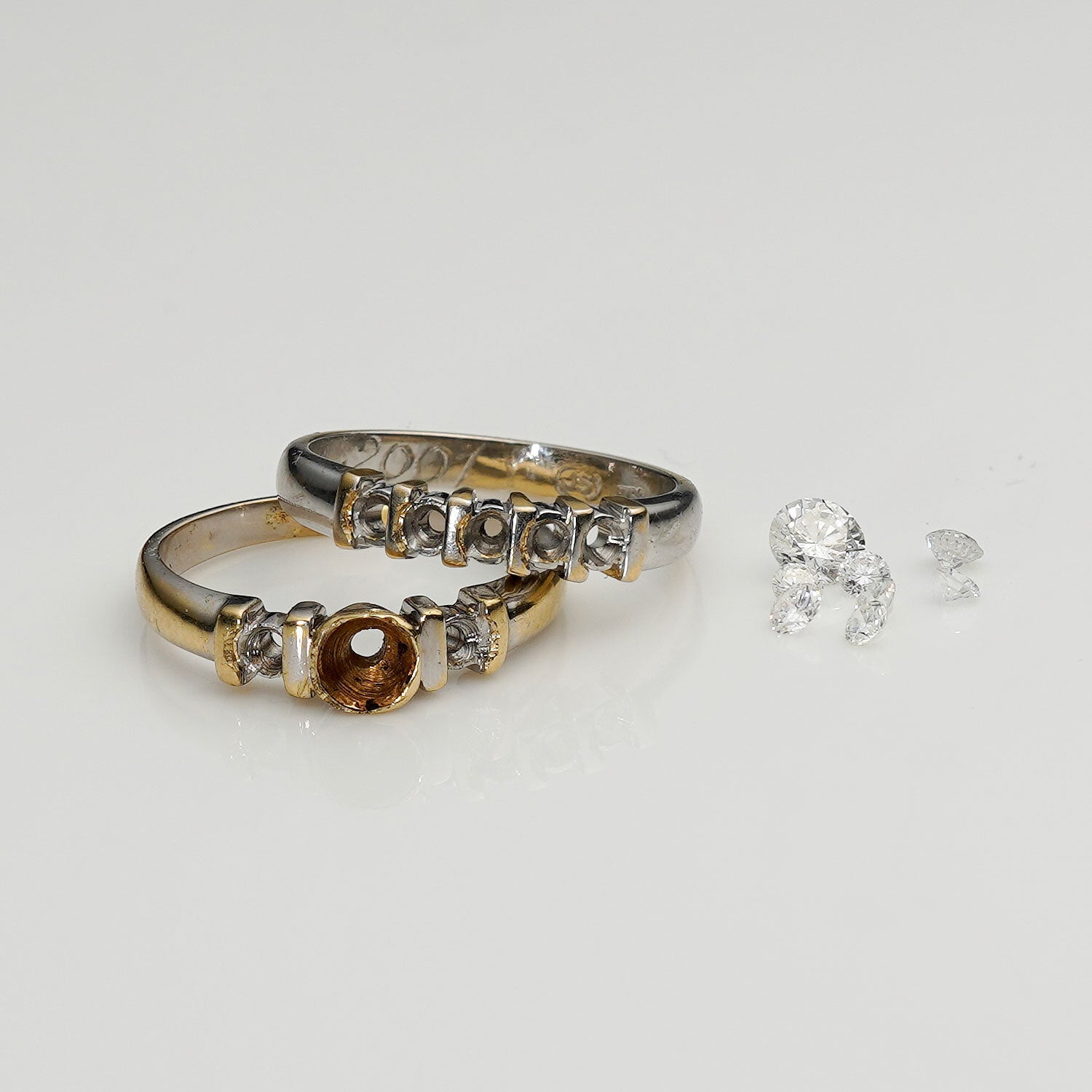Our client came to us with her cherished rings, originally made in yellow gold but rhodium-plated to look like white gold. She was frustrated with the constant need to reapply the rhodium, which was not only expensive but also couldn’t fully hide the warm tones of the gold underneath, as you can see in the before photos. Understanding her attachment to the rings, we carefully replicated them in 18ct white gold.