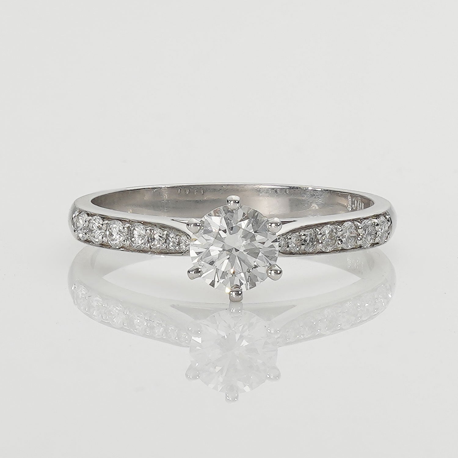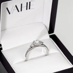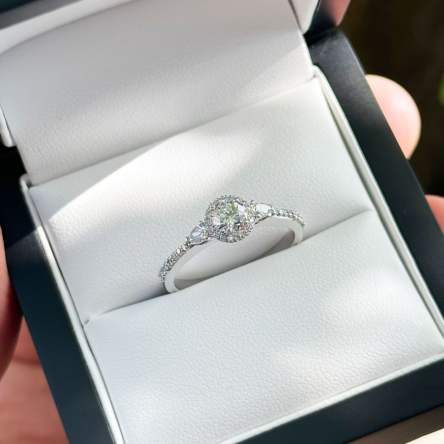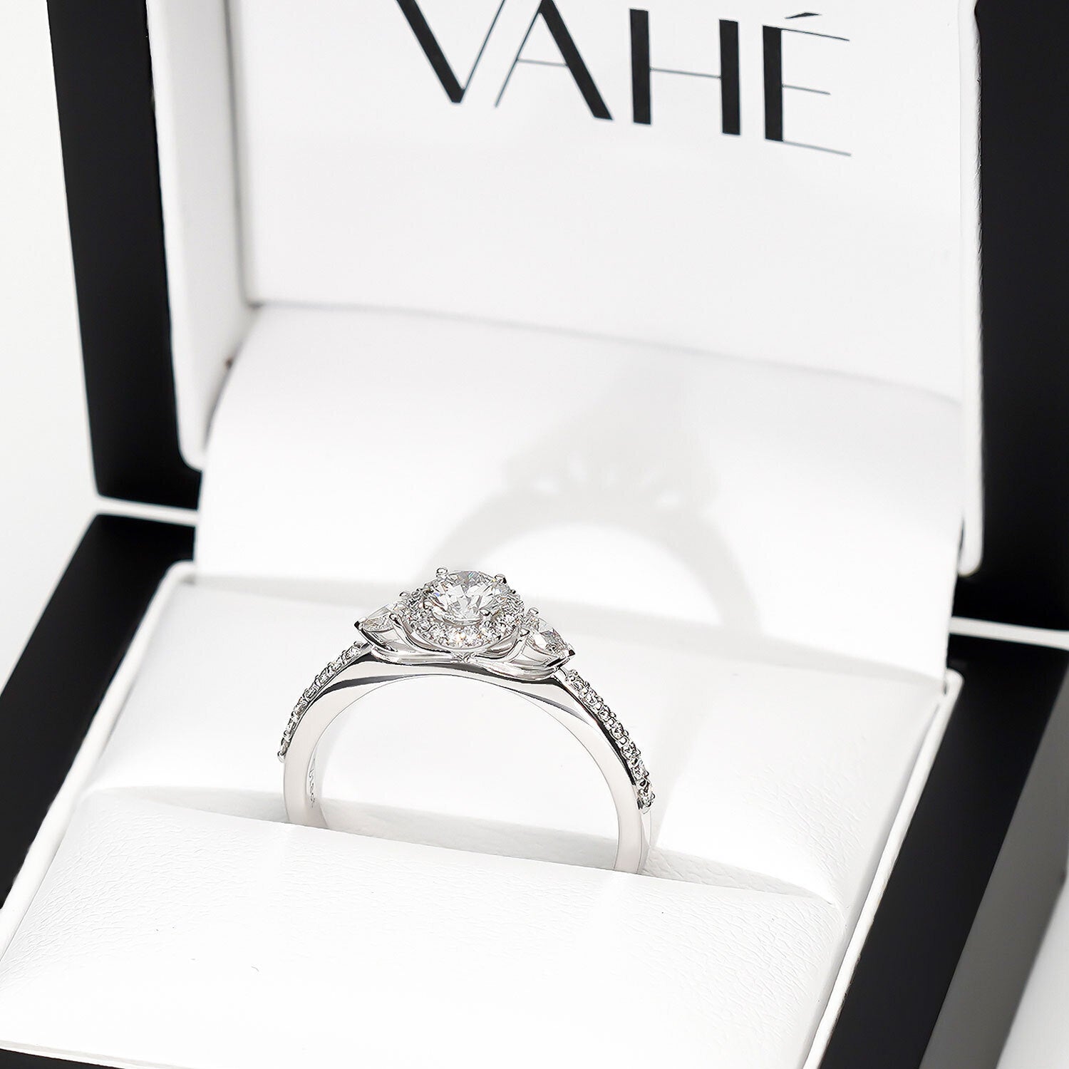 At its centre is a stunning GIA certified F/VS2 round brilliant cut natural diamond with a tw. of 0.50ct. Surrounded by a fine halo of shimmering white diamonds, this exquisite centerpiece is further enhanced by two calibrated pear shape natural diamonds set on both sides. Meticulously crafted in 18ct white gold and with attention to detail, it is a testament to our commitment to creating truly extraordinary pieces.
