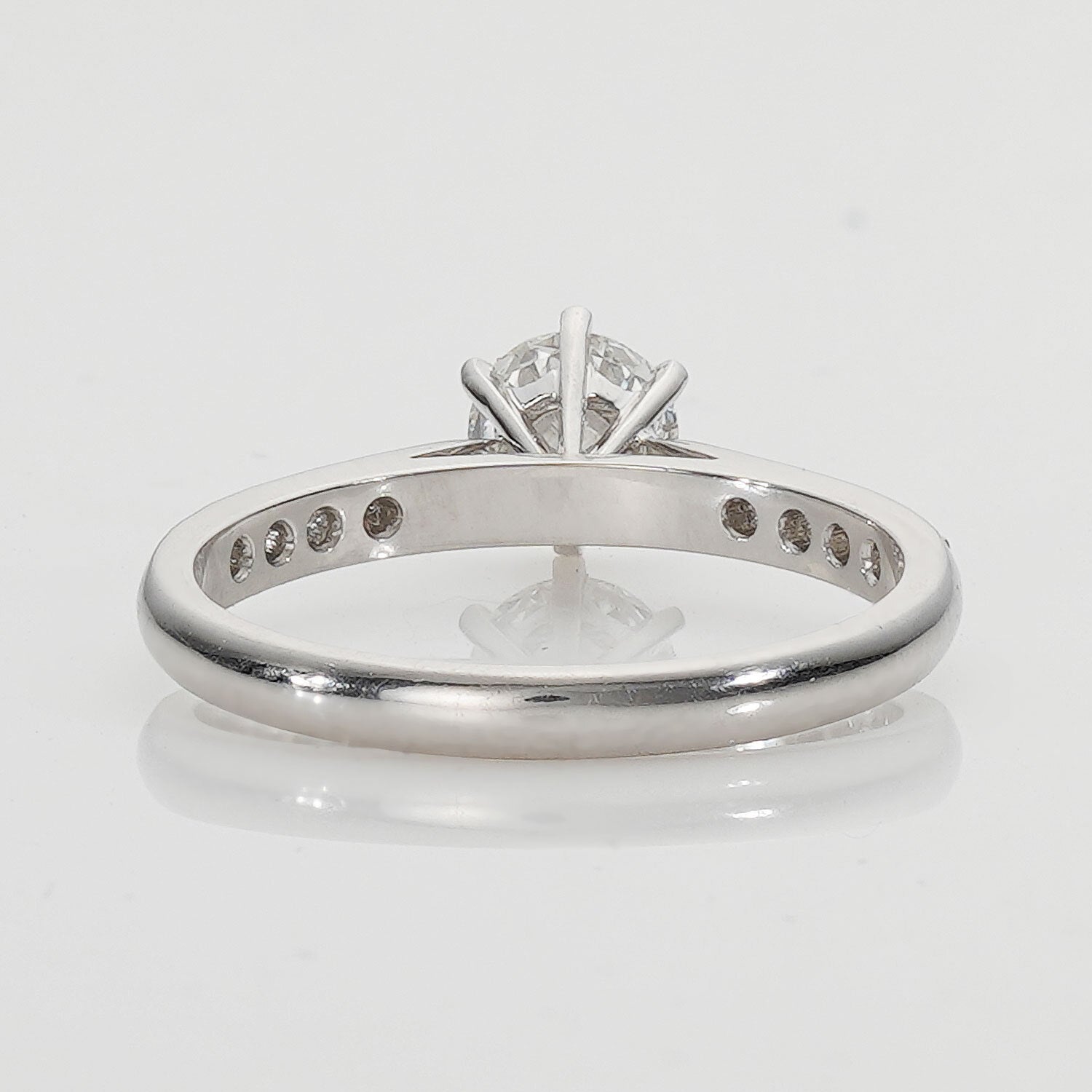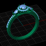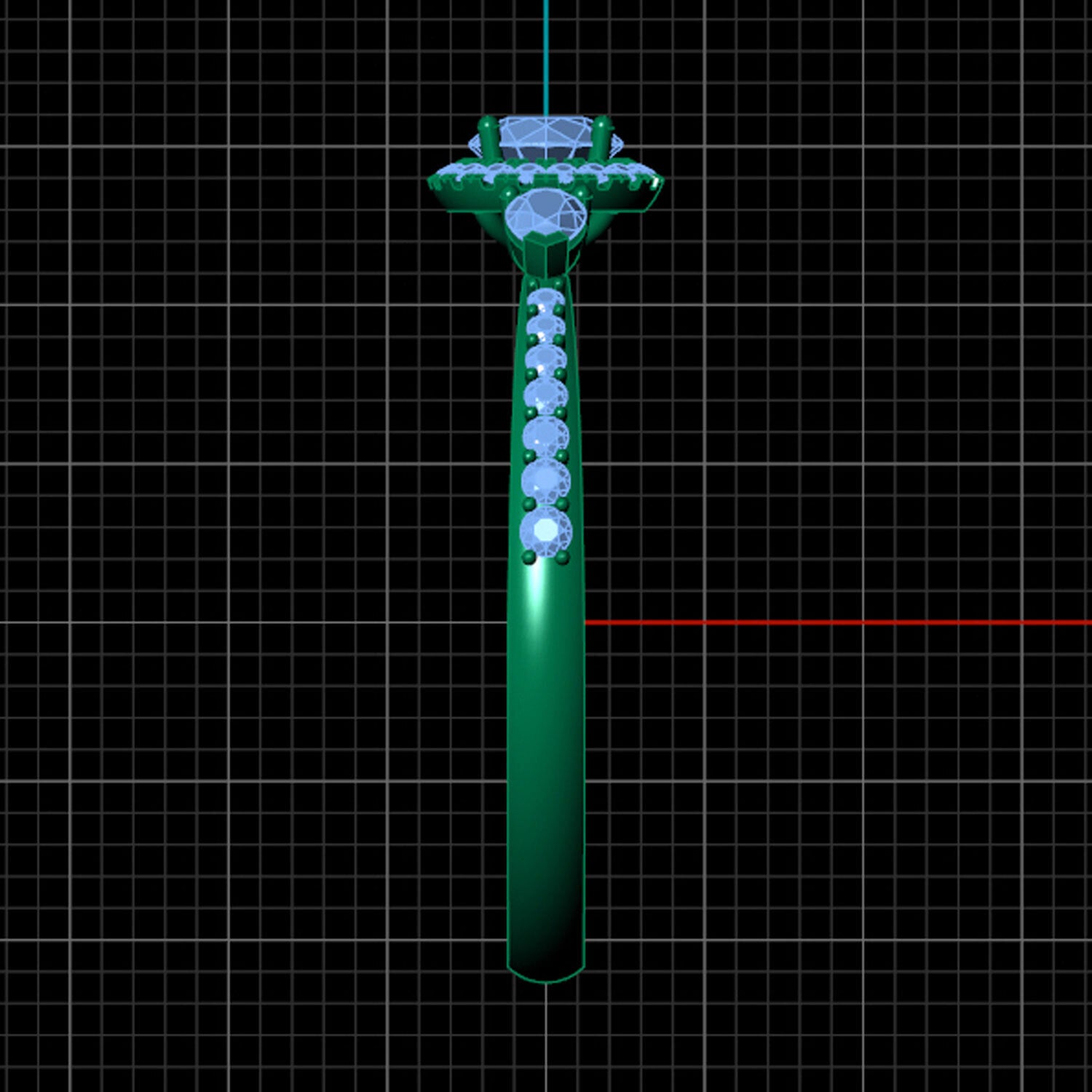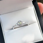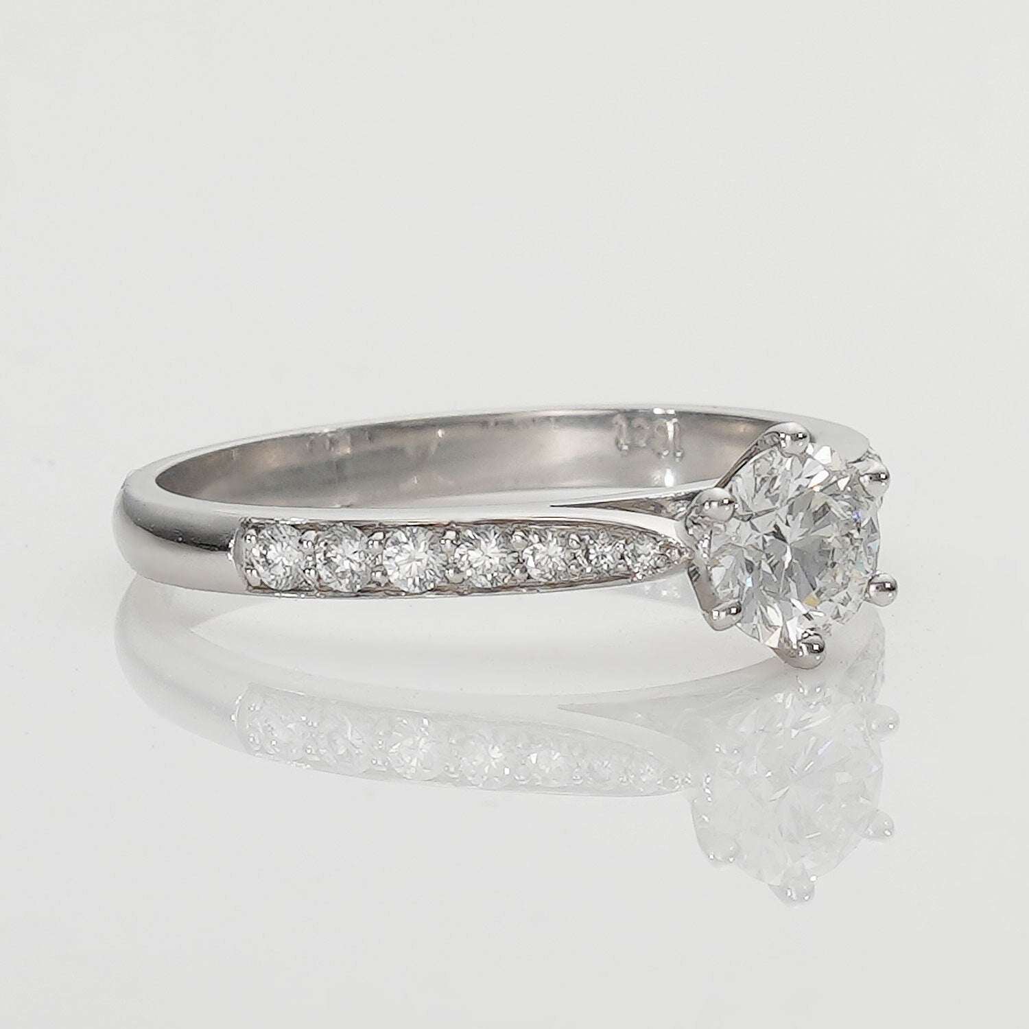 At its centre is a stunning GIA certified F/VS2 round brilliant cut natural diamond with a tw. of 0.50ct. Surrounded by a fine halo of shimmering white diamonds, this exquisite centerpiece is further enhanced by two calibrated pear shape natural diamonds set on both sides. Meticulously crafted in 18ct white gold and with attention to detail, it is a testament to our commitment to creating truly extraordinary pieces.