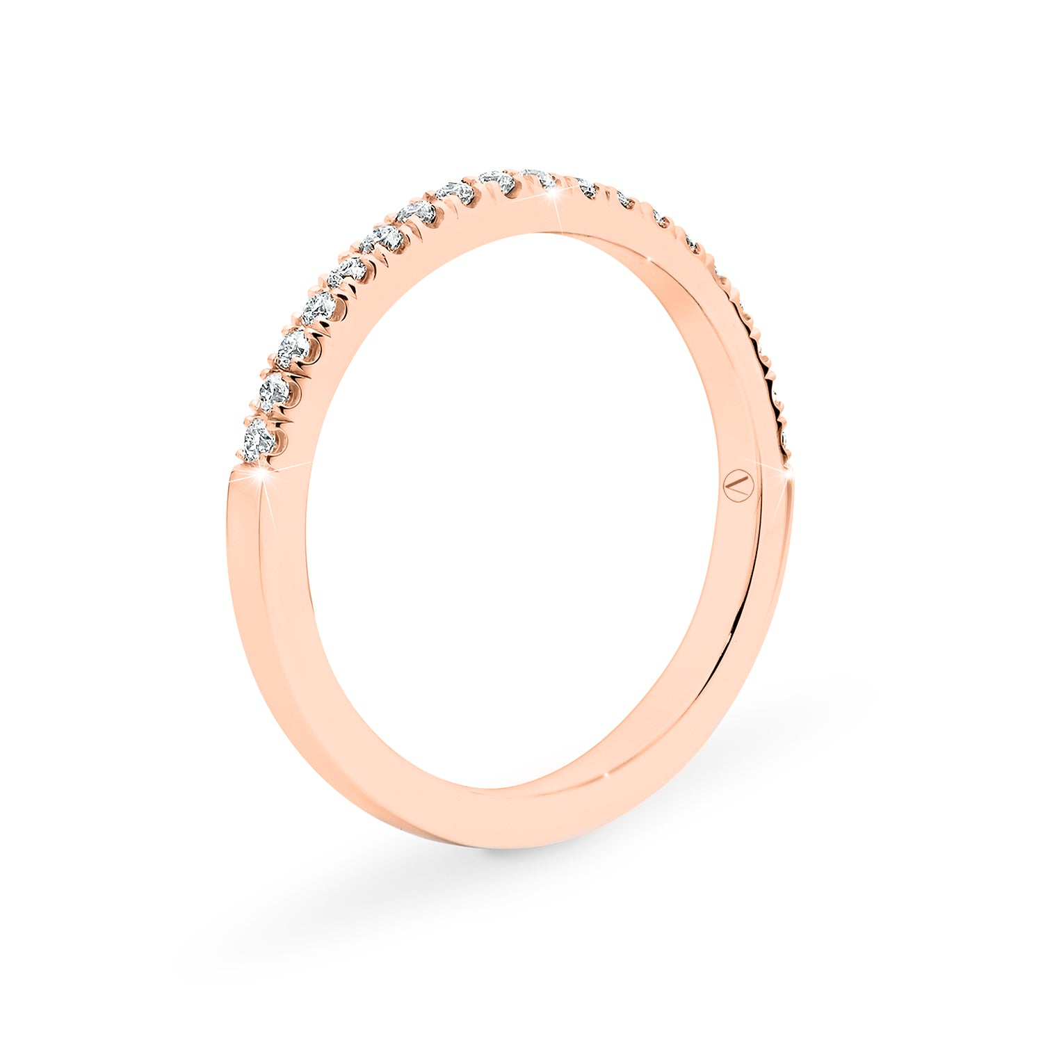 A delicate "V" split wedding ring set with 0.19ct tw. of round brilliant cut diamonds extending halfway down the band. A compliment too many engagement rings or perfect as an anniversary ring. Handmade in either 9ct or 18ct rose gold.