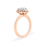 This is our rendition of a classically romantic setting. The brilliance of your centre stone is enhanced by a series of individually handset pavé diamonds. Carefully designed to sit at a perfect height on your finger and flush with your matching wedding ring, our signature finely sculpted wire basket flows seamlessly toward the underside of the halo, drawing in light so your diamond shines bright. Handmade in 9ct or 18ct rose gold.