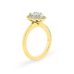 This is our rendition of a classically romantic setting. The brilliance of your centre stone is enhanced by a series of individually handset pavé diamonds. Carefully designed to sit at a perfect height on your finger and flush with your matching wedding ring, our signature finely sculpted wire basket flows seamlessly toward the underside of the halo, drawing in light so your diamond shines bright. Handmade in 9ct or 18ct yellow gold.