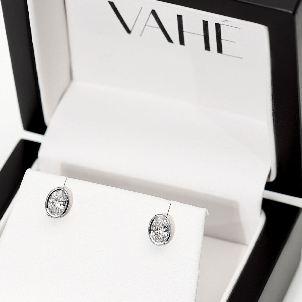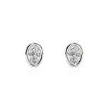Stud earrings featuring a matching pair of oval shape diamonds set in secure bezels. Handmade in 9ct or 18ct white gold. Included with the purchase are two butterfly push back clips measuring 5.5mm.