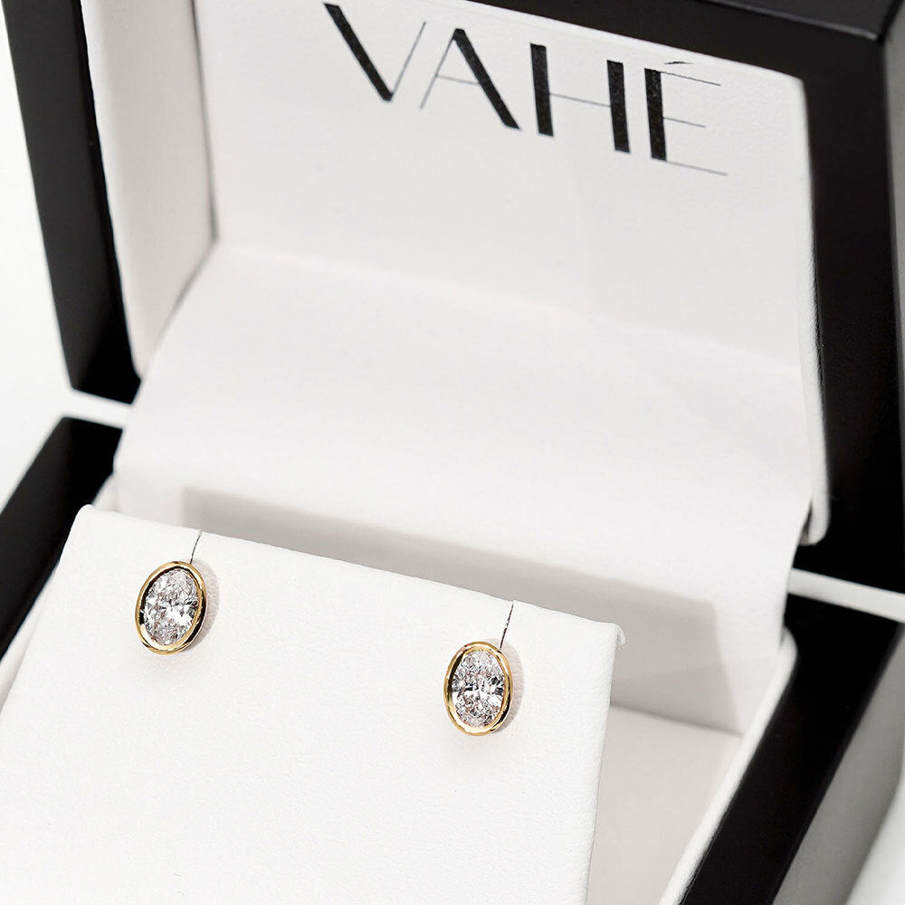Stud earrings featuring a matching pair of oval shape diamonds set in secure bezels. Handmade in 9ct or 18ct yellow gold. Included with the purchase are two butterfly push back clips measuring 5.5mm.